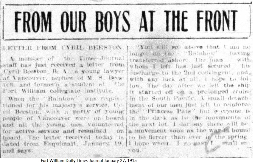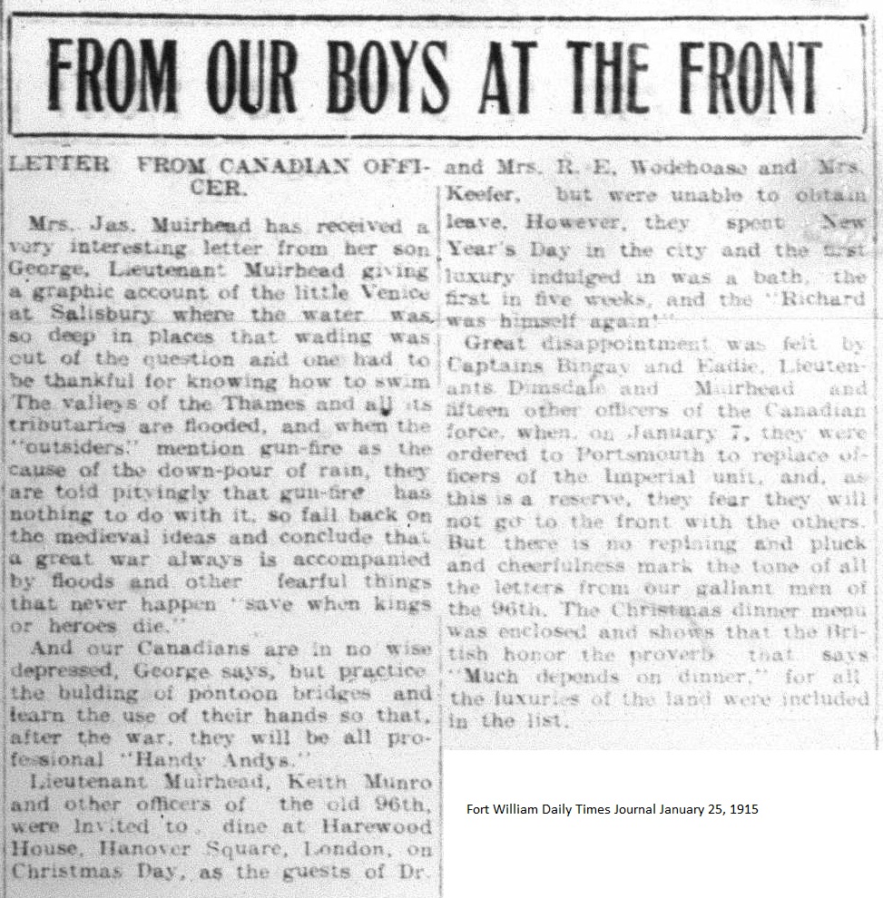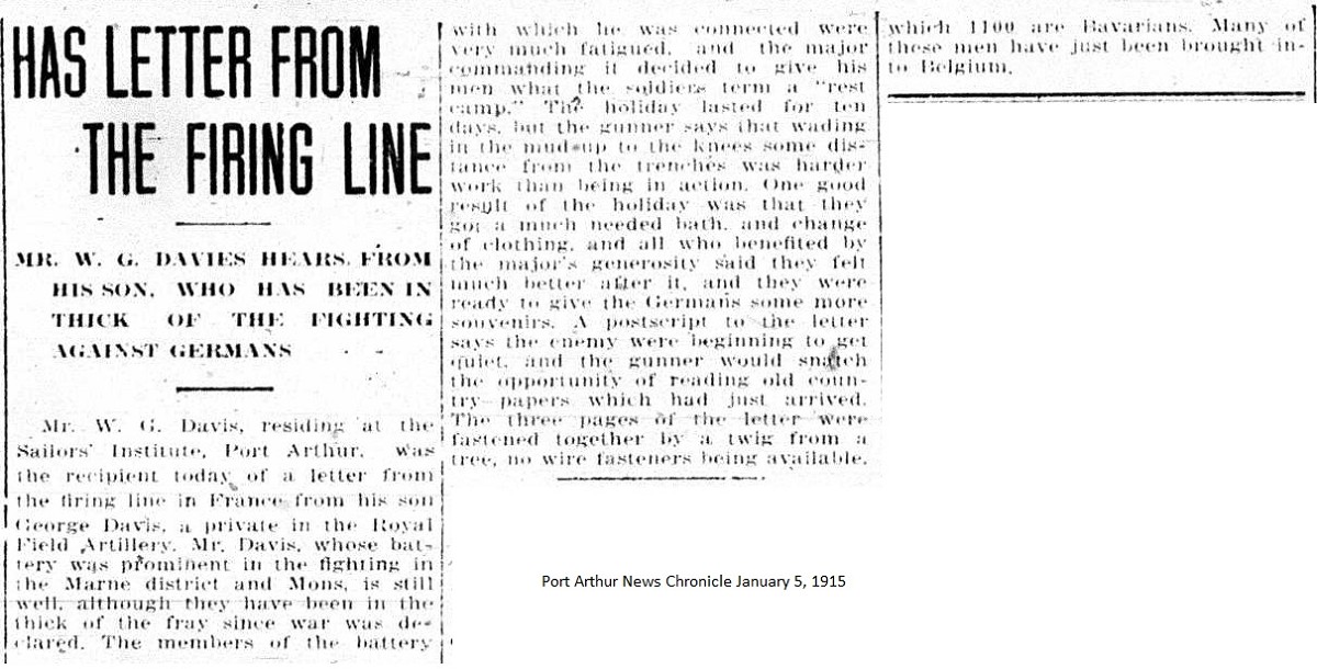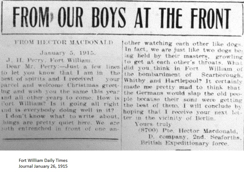 The Fort William Daily Times Journal and the Port Arthur Daily News respectfully solicited letters from soldiers at the front – or extracts therefrom – during the First World War. Any reader who had a letter from a relative or friend with the British, French or Russian forces was invited to submit said letter for publication to the community.