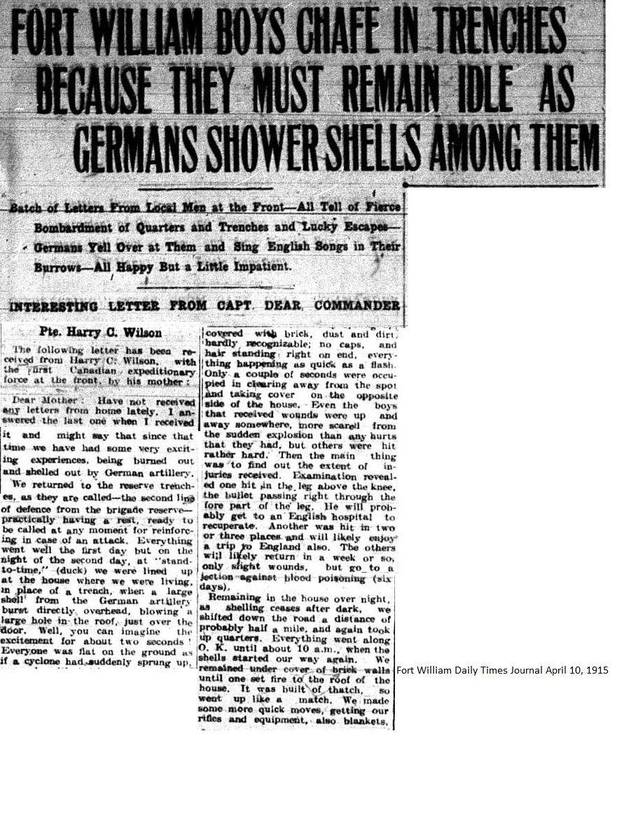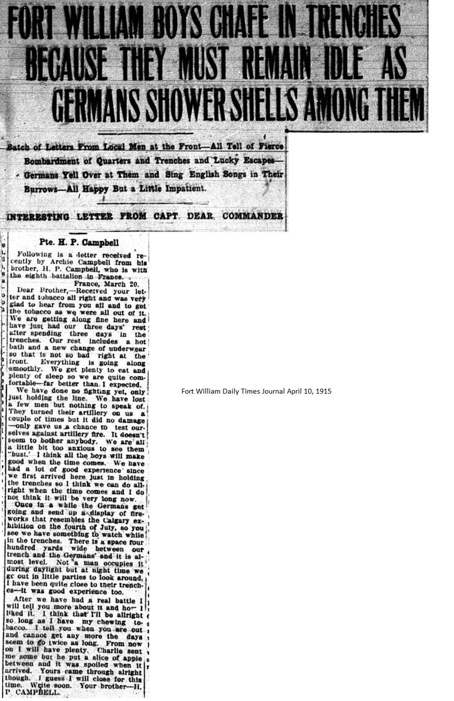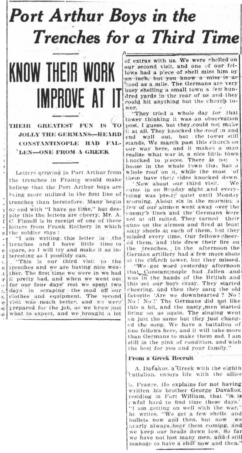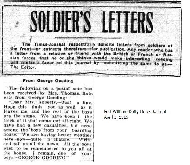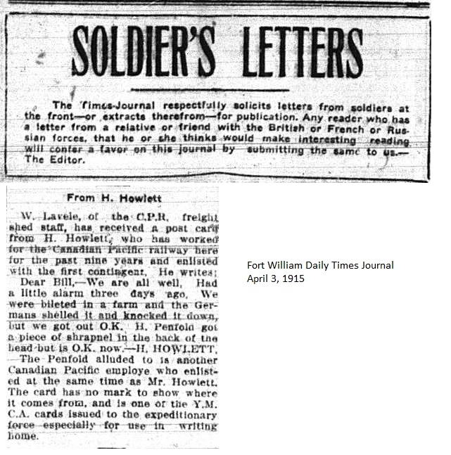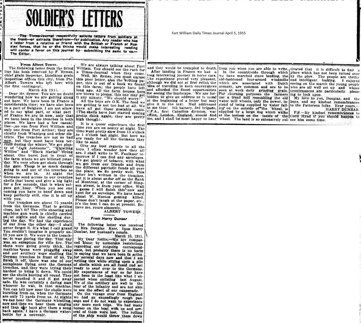 The Fort William Daily Times Journal and the Port Arthur Daily News respectfully solicited letters from soldiers at the front – or extracts therefrom – during the First World War. Any reader who had a letter from a relative or friend with the British, French or Russian forces was invited to submit said letter for publication to the community.