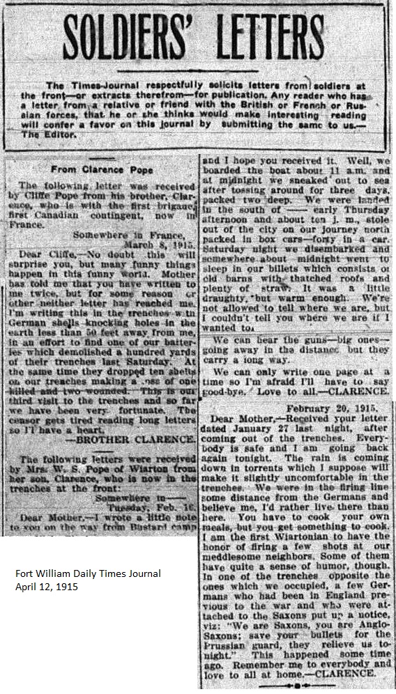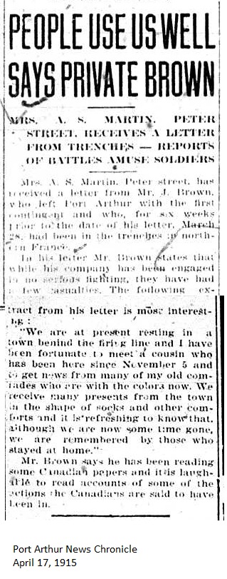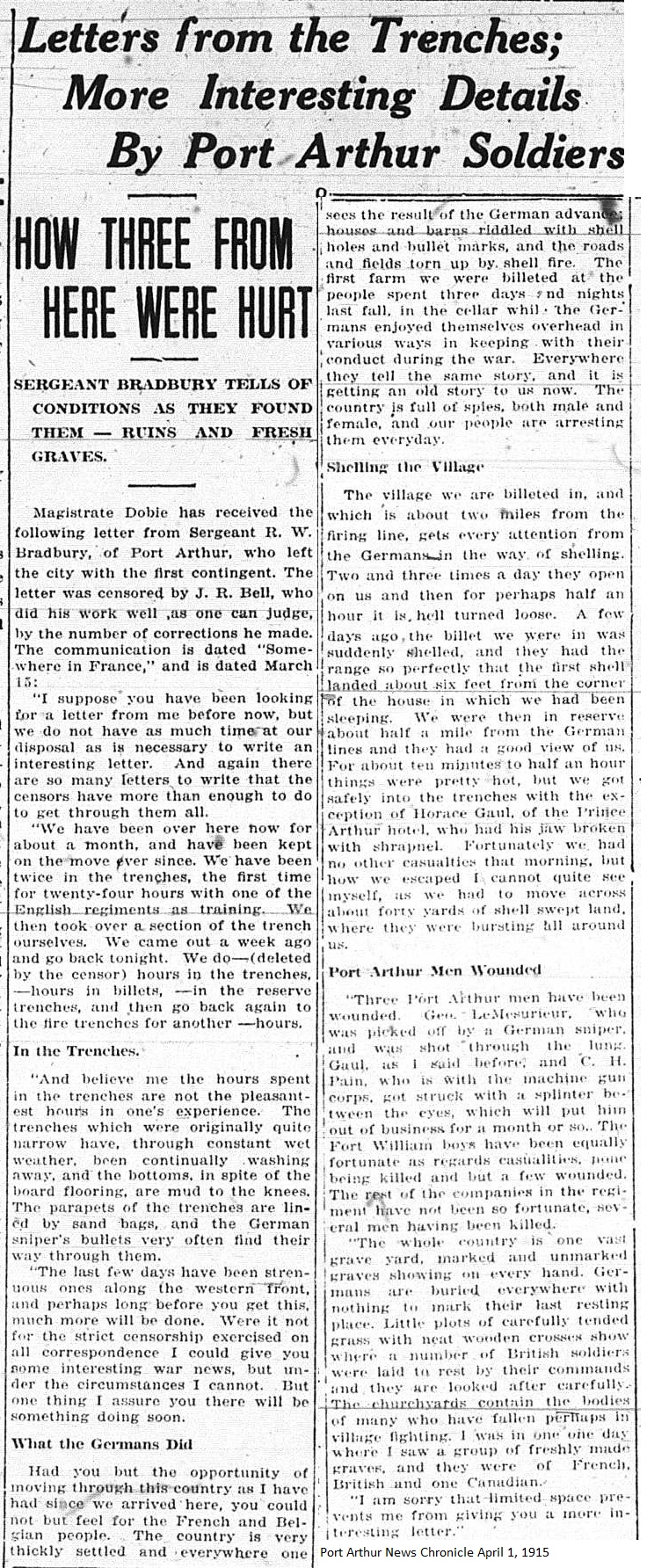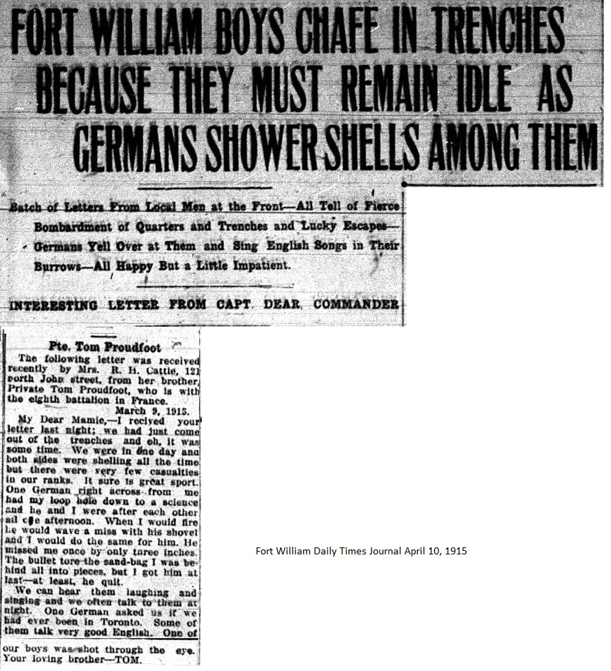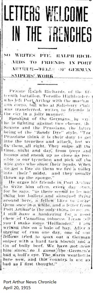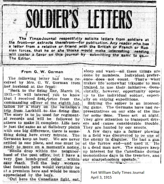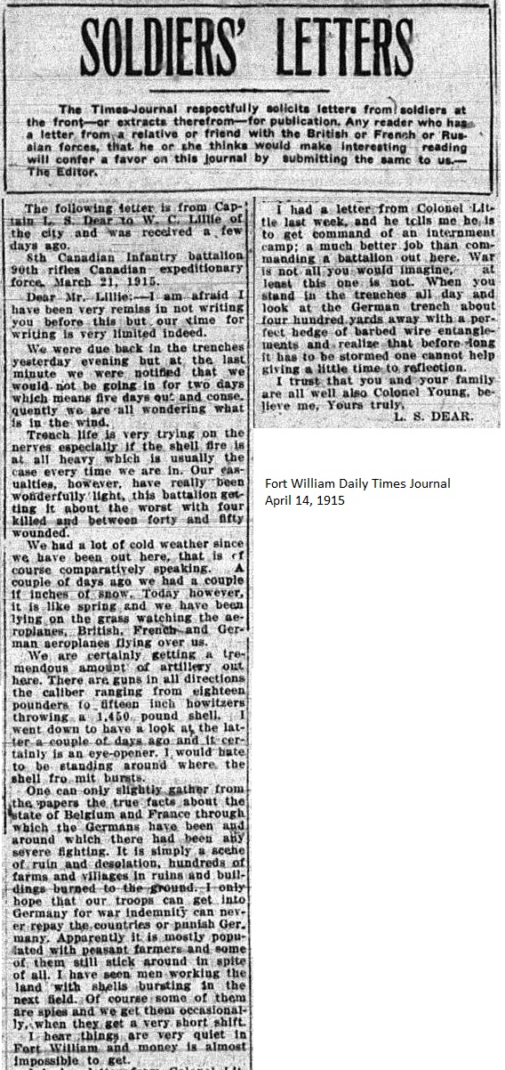 The Fort William Daily Times Journal and the Port Arthur Daily News respectfully solicited letters from soldiers at the front – or extracts therefrom – during the First World War. Any reader who had a letter from a relative or friend with the British, French or Russian forces was invited to submit said letter for publication to the community.