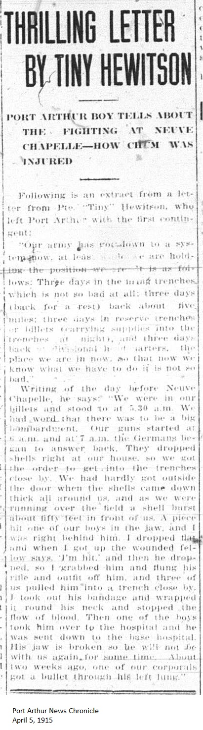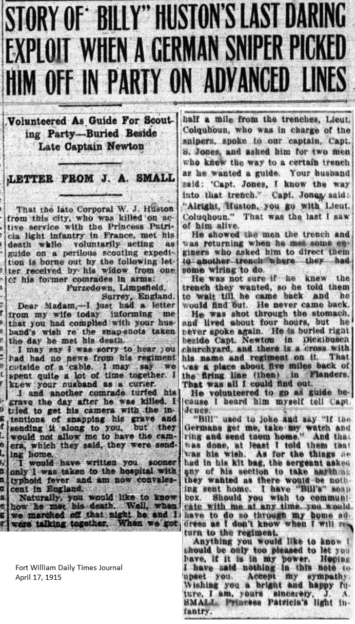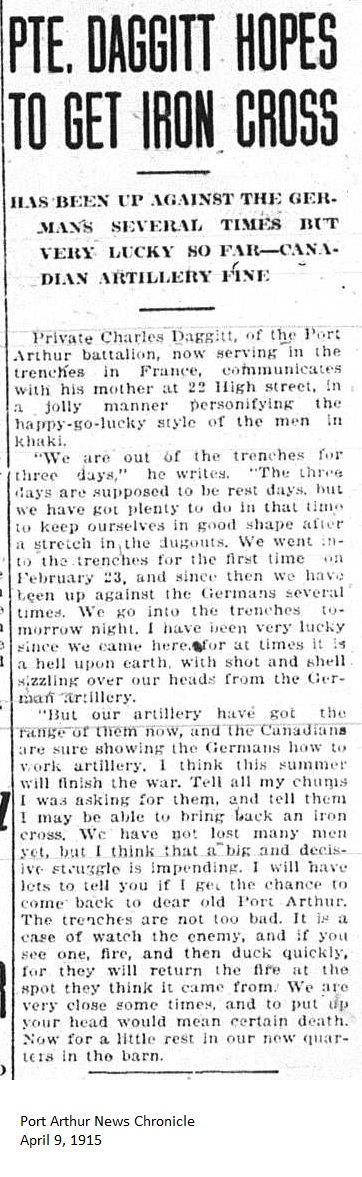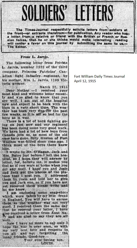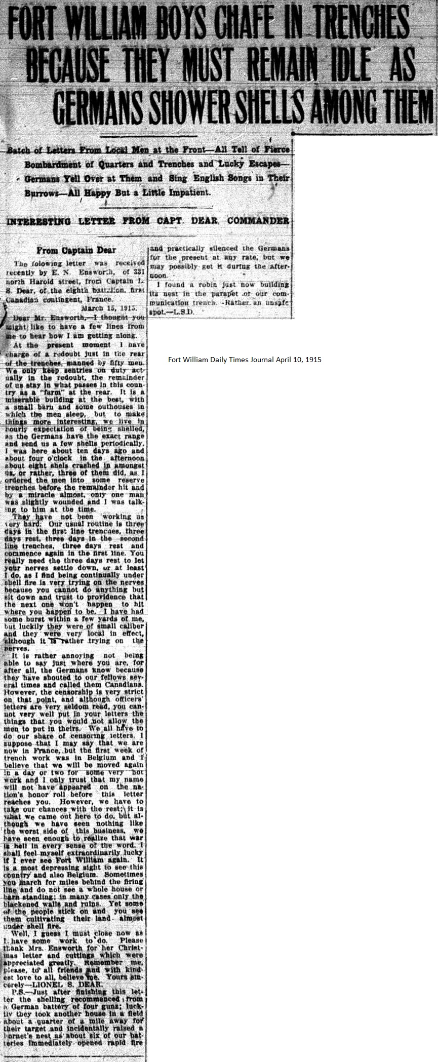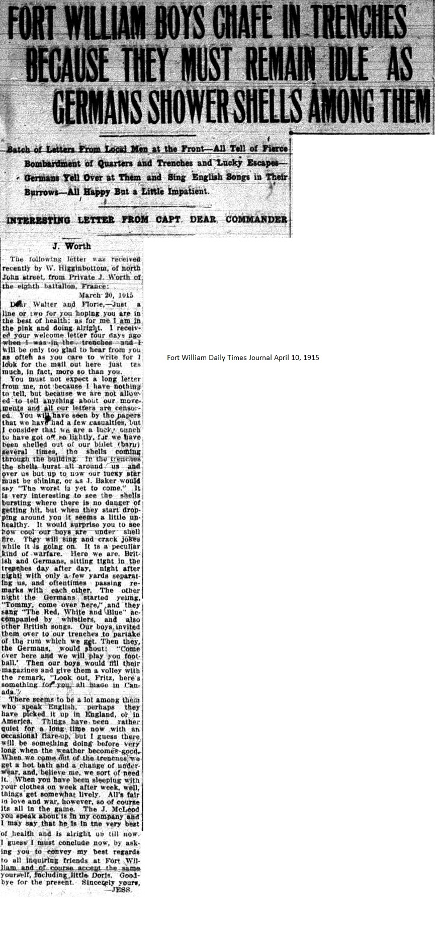 The Fort William Daily Times Journal and the Port Arthur Daily News respectfully solicited letters from soldiers at the front – or extracts therefrom – during the First World War. Any reader who had a letter from a relative or friend with the British, French or Russian forces was invited to submit said letter for publication to the community.