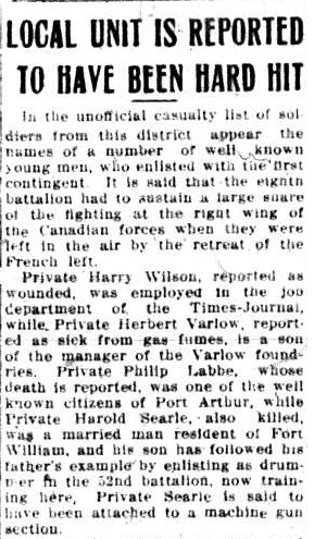The above index contains published death notices from the Fort William Daily Times Journal (FWDTJ) and the Port Arthur Daily News (PADN), along with links to available attestation papers (through Library and Archives Canada) and Burial Records (through the Commonwealth War Graves Commission) for local individuals who were killed during or as a result of the First World War. The index is updated monthly to coincide with the centennial of these events and commemorate the sacrifice of those individuals and their families. If you know of someone who should be included here, please contact us at ww1project@tbpl.ca.