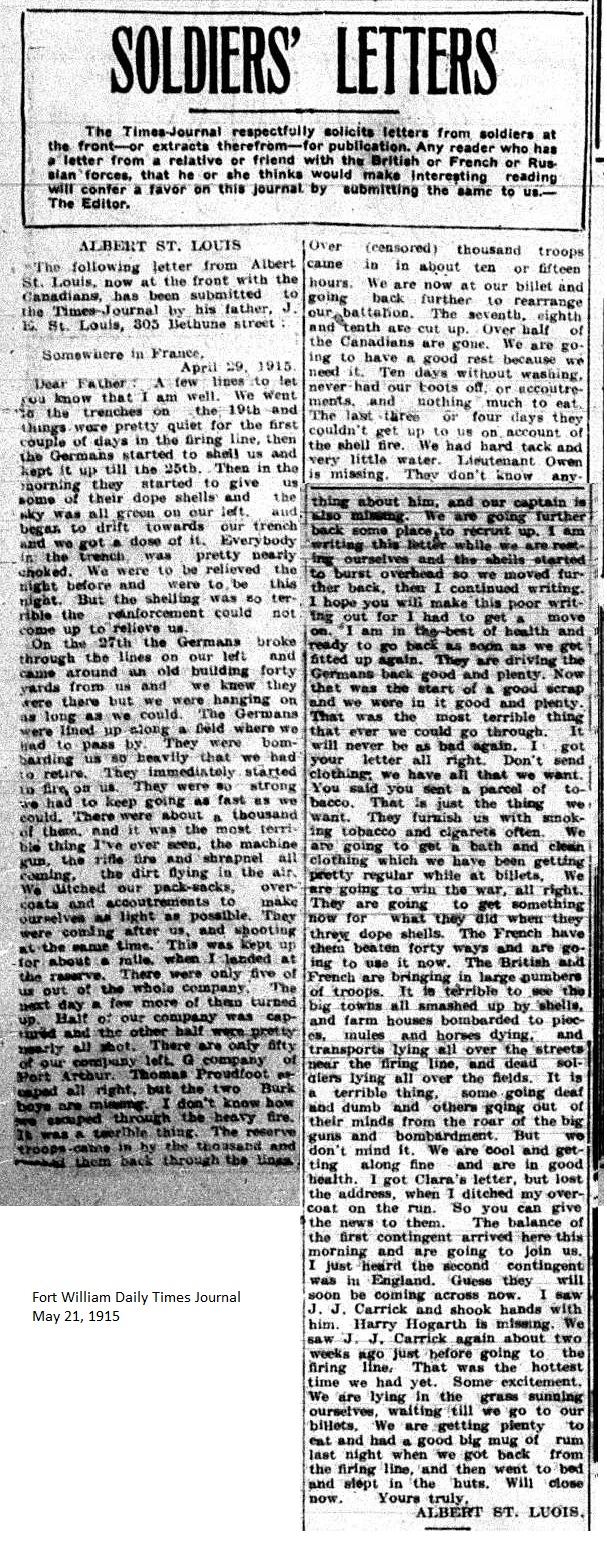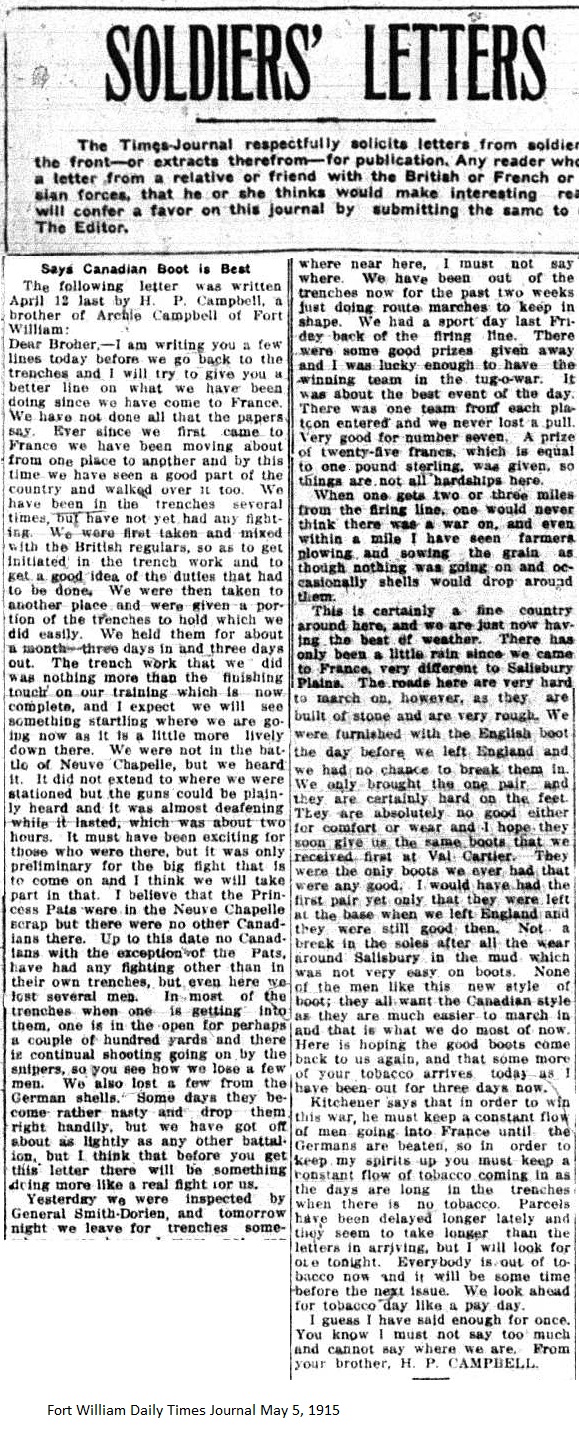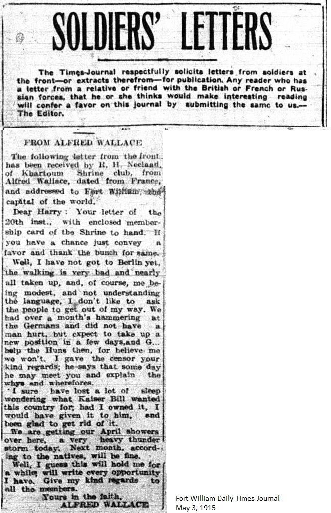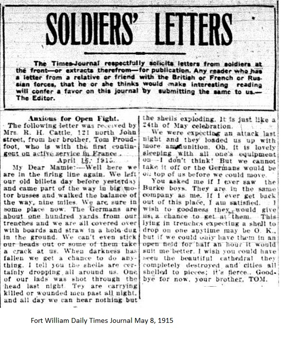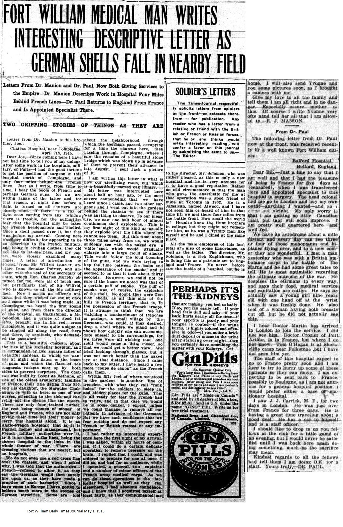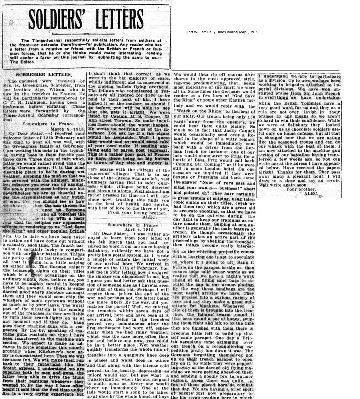 The Fort William Daily Times Journal and the Port Arthur Daily News respectfully solicited letters from soldiers at the front – or extracts therefrom – during the First World War. Any reader who had a letter from a relative or friend with the British, French or Russian forces was invited to submit said letter for publication to the community.