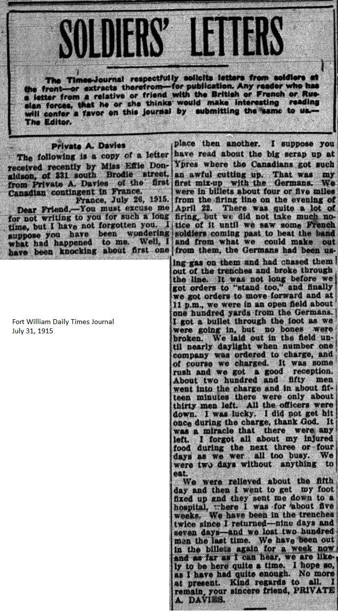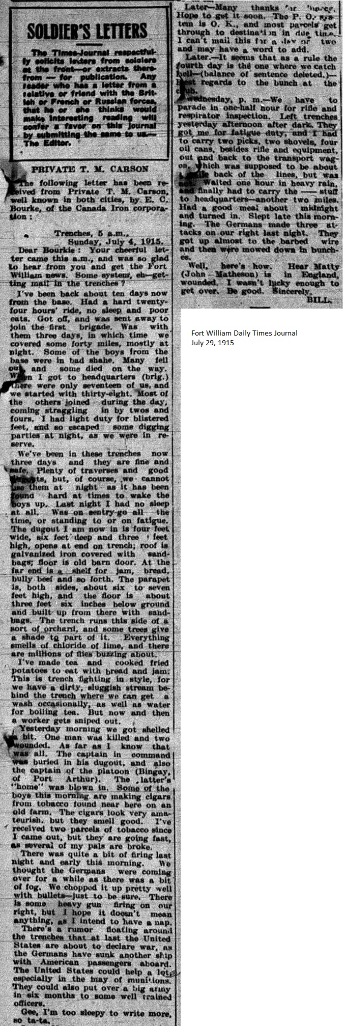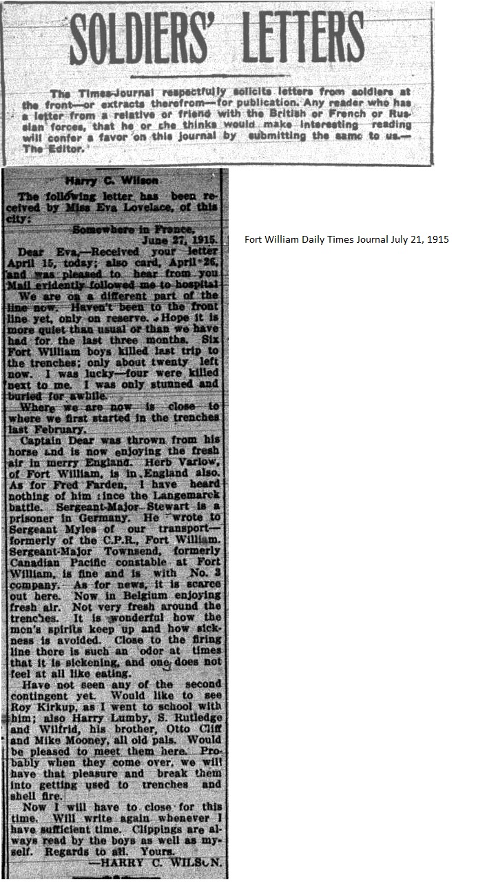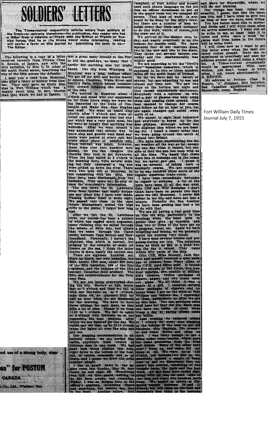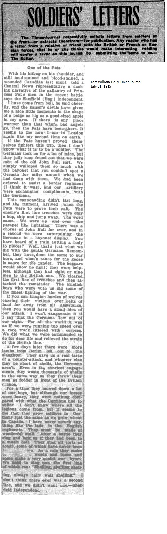 The Fort William Daily Times Journal and the Port Arthur Daily News respectfully solicited letters from soldiers at the front – or extracts therefrom – during the First World War. Any reader who had a letter from a relative or friend with the British, French or Russian forces was invited to submit said letter for publication to the community.