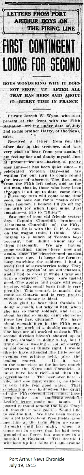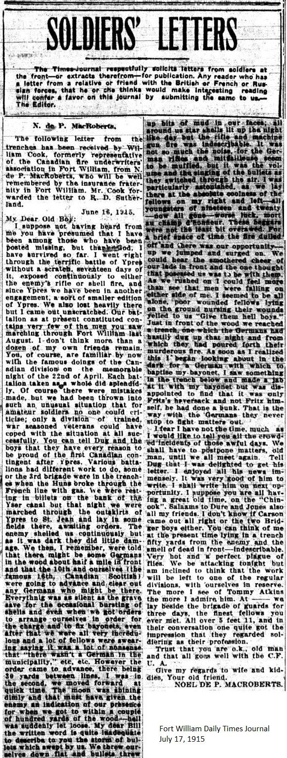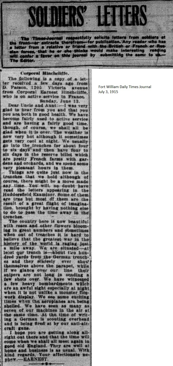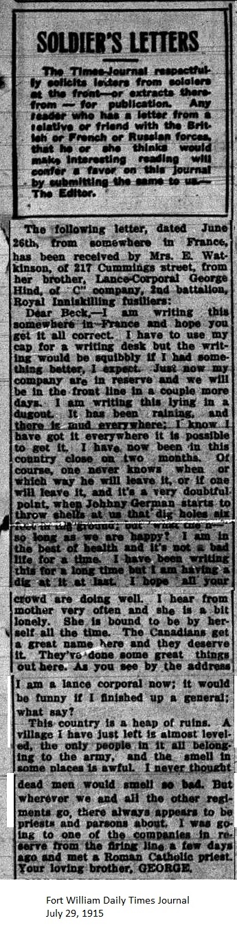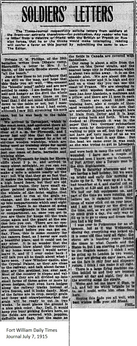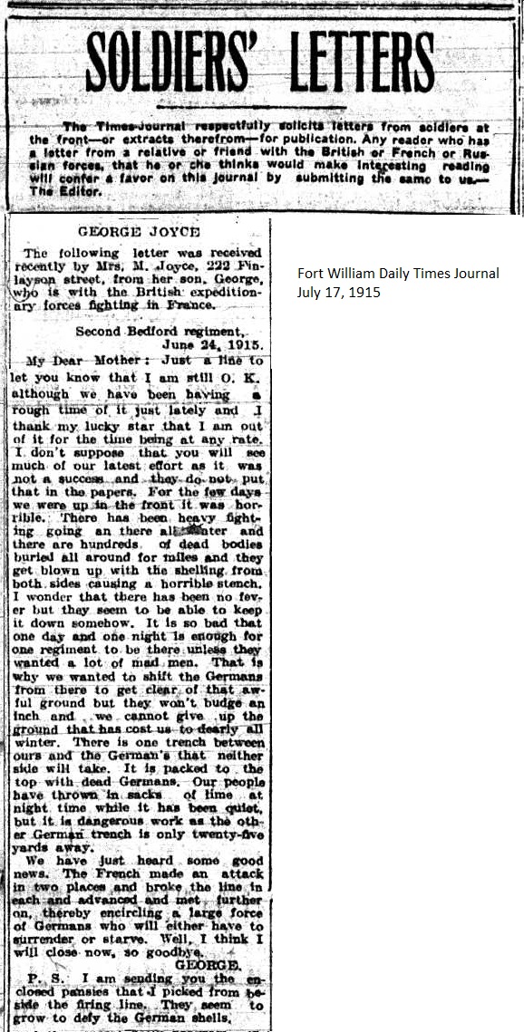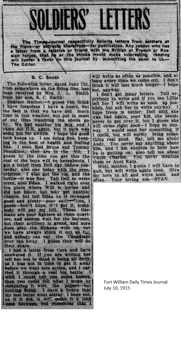 The Fort William Daily Times Journal and the Port Arthur Daily News respectfully solicited letters from soldiers at the front – or extracts therefrom – during the First World War. Any reader who had a letter from a relative or friend with the British, French or Russian forces was invited to submit said letter for publication to the community.