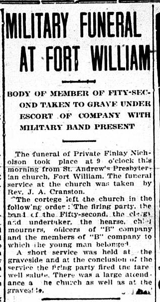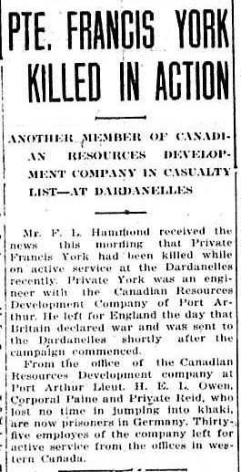 The above index contains published death notices from the Fort William Daily Times Journal (FWDTJ) and the Port Arthur Daily News (PADN), along with links to available attestation papers (through Library and Archives Canada) and Burial Records (through the Commonwealth War Graves Commission) for local individuals who were killed during or as a result of the First World War. The index is updated monthly to coincide with the centennial of these events and commemorate the sacrifice of those individuals and their families. If you know of someone who should be included here, please contact us at ww1project@tbpl.ca.