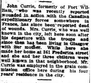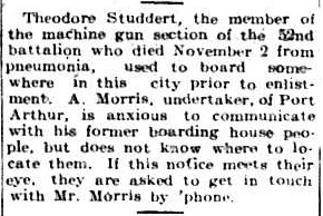 The above index contains published death notices from the Fort William Daily Times Journal (FWDTJ) and the Port Arthur Daily News (PADN), along with links to available attestation papers (through Library and Archives Canada) and Burial Records (through the Commonwealth War Graves Commission) for local individuals who were killed during or as a result of the First World War. The index is updated monthly to coincide with the centennial of these events and commemorate the sacrifice of those individuals and their families. If you know of someone who should be included here, please contact us at ww1project@tbpl.ca.