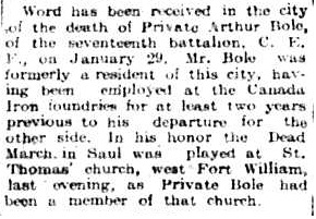 The above index contains published death notices from the Fort William Daily Times Journal (FWDTJ) and the Port Arthur Daily News (PADN), along with links to available attestation papers (through Library and Archives Canada) and Burial Records (through the Commonwealth War Graves Commission) for local individuals who were killed during or as a result of the First World War. The index is updated monthly to coincide with the centennial of these events and commemorate the sacrifice of those individuals and their families. If you know of someone who should be included here, please contact us at ww1project@tbpl.ca.