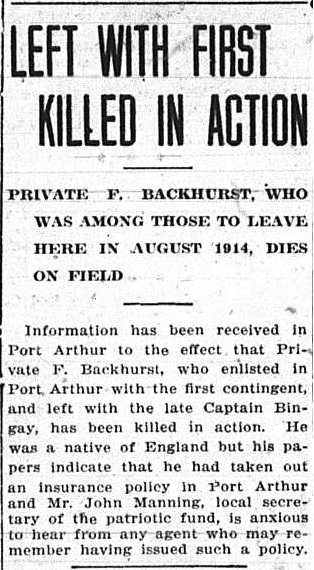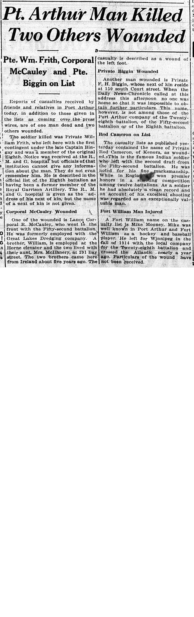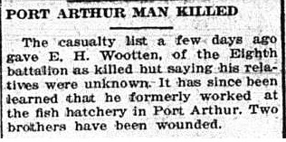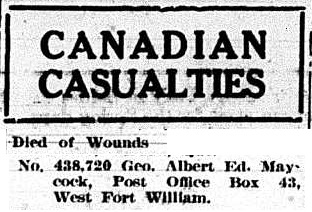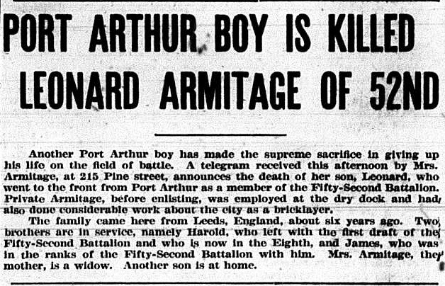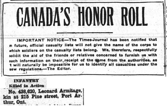 The above index contains published death notices from the Fort William Daily Times Journal (FWDTJ) and the Port Arthur Daily News (PADN), along with links to available attestation papers (through Library and Archives Canada) and Burial Records (through the Commonwealth War Graves Commission) for local individuals who were killed during or as a result of the First World War. The index is updated monthly to coincide with the centennial of these events and commemorate the sacrifice of those individuals and their families. If you know of someone who should be included here, please contact us at ww1project@tbpl.ca.