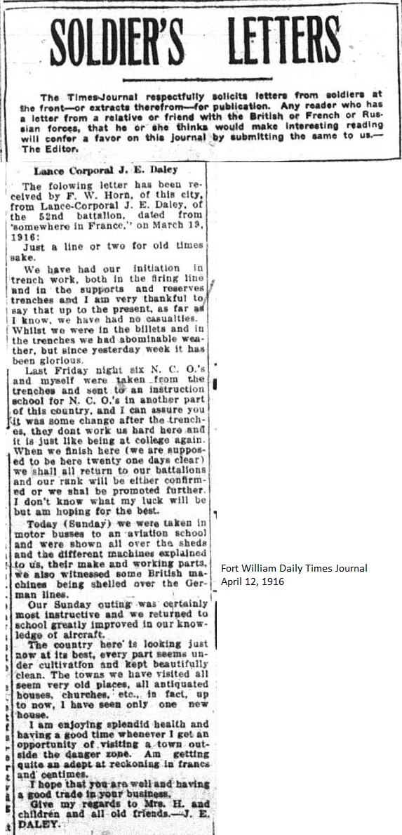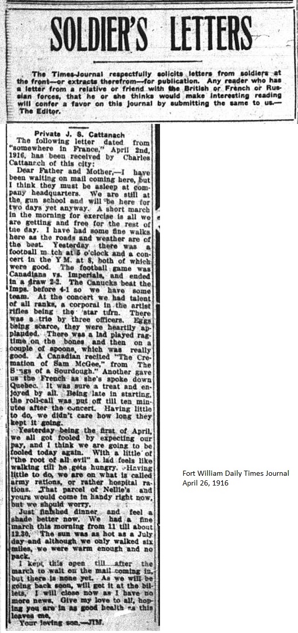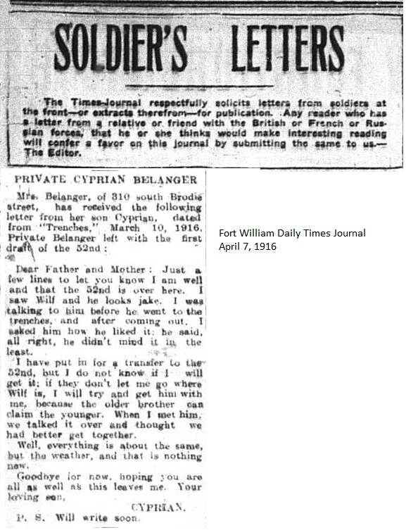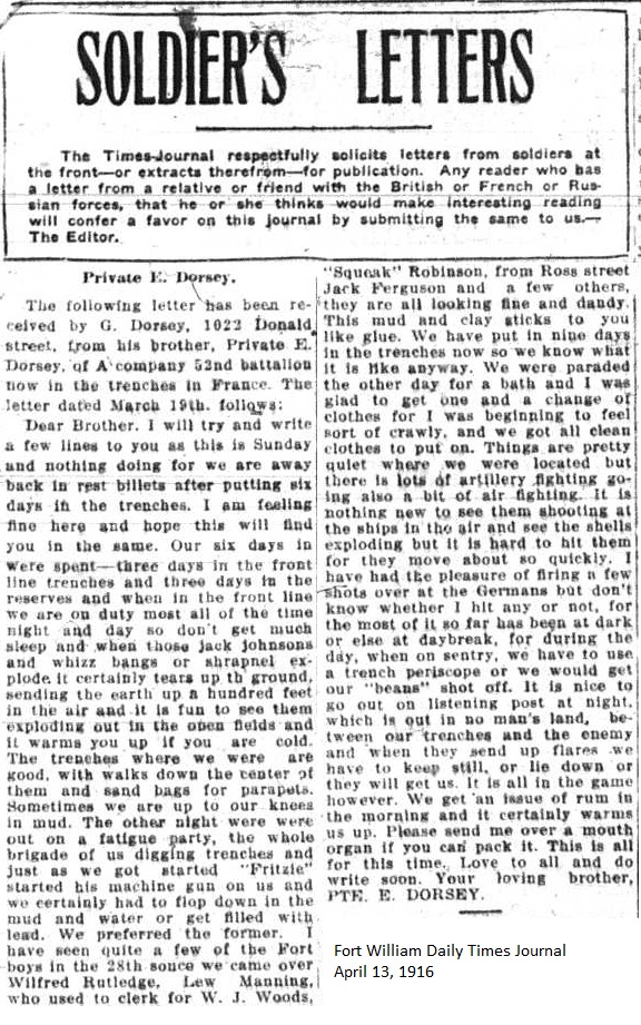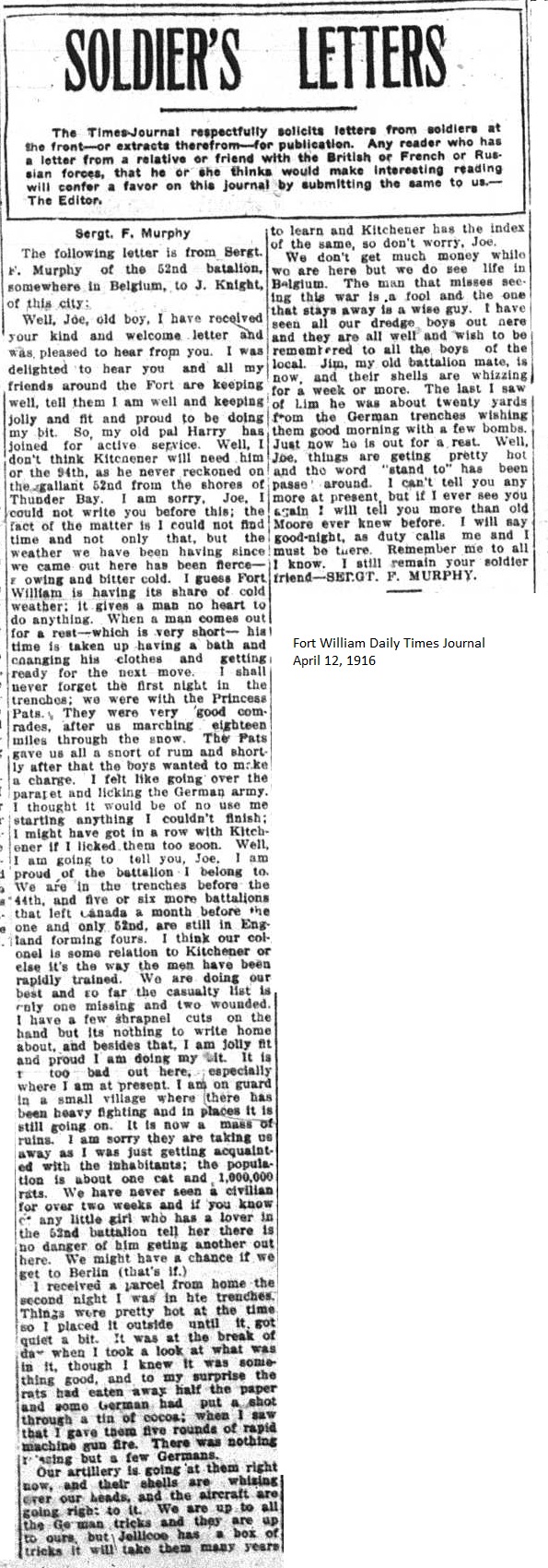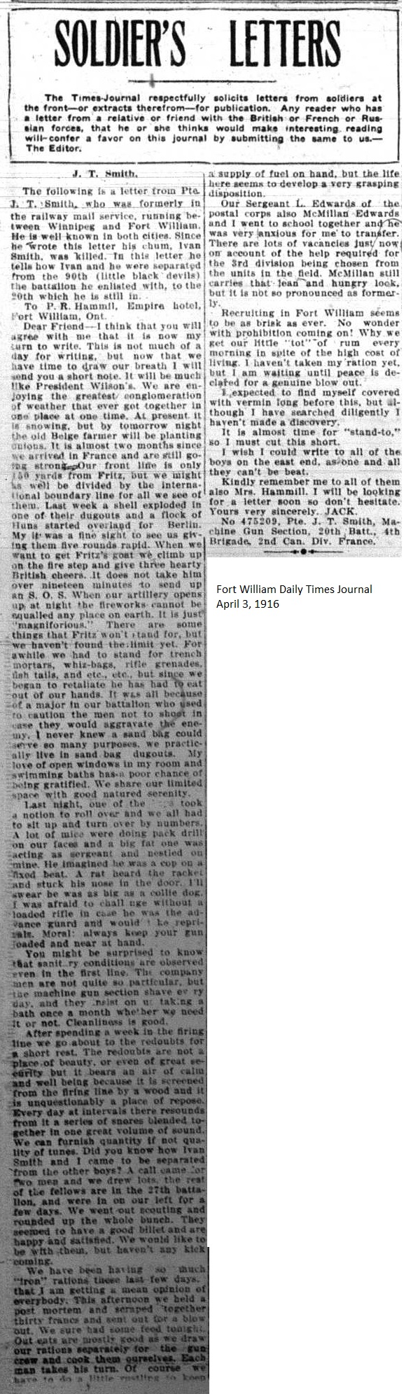 The Fort William Daily Times Journal and the Port Arthur Daily News respectfully solicited letters from soldiers at the front – or extracts therefrom – during the First World War. Any reader who had a letter from a relative or friend with the British, French or Russian forces was invited to submit said letter for publication to the community.