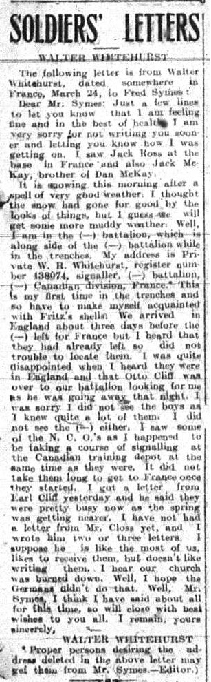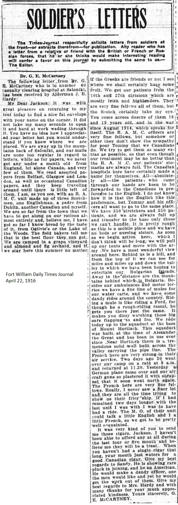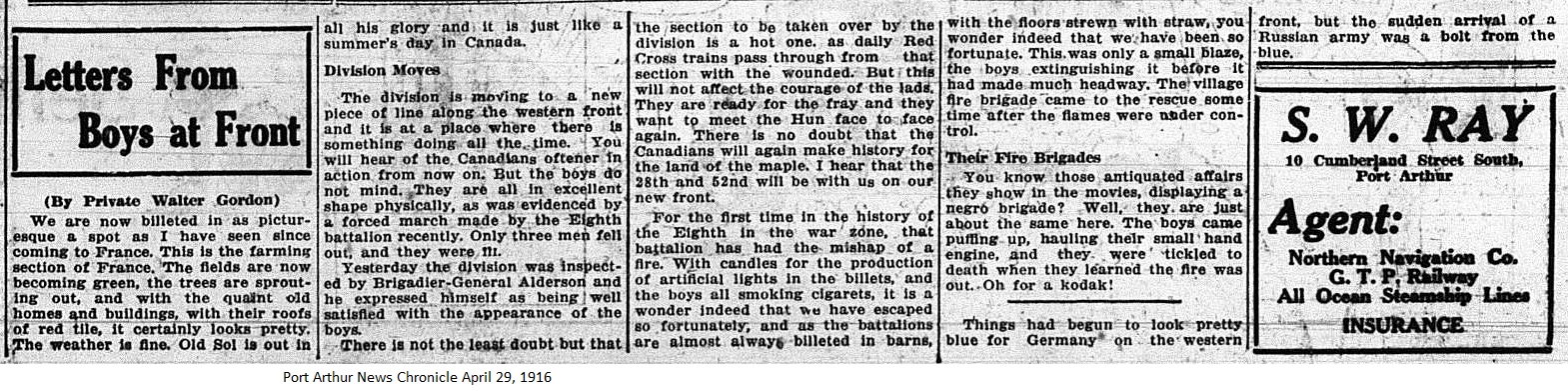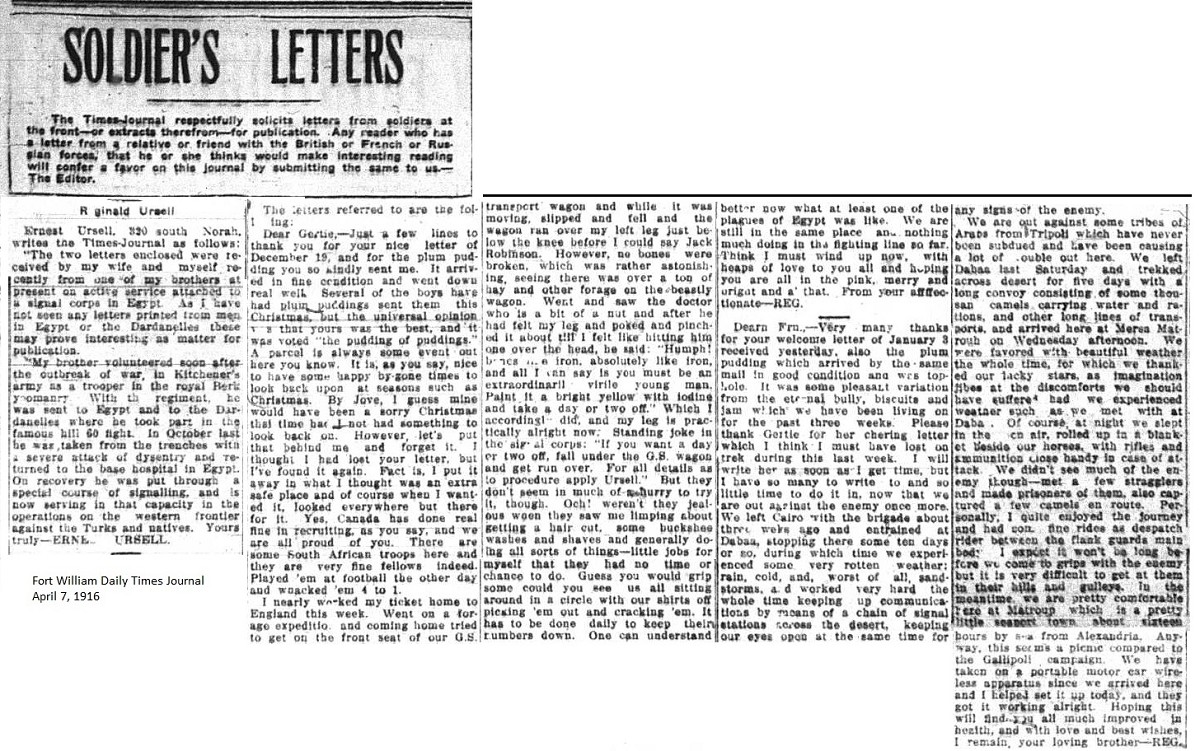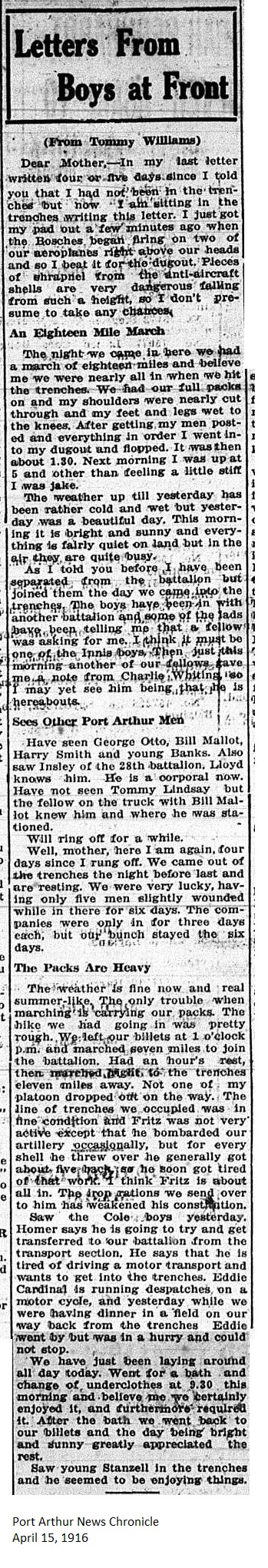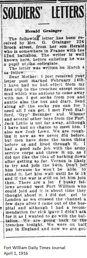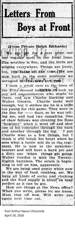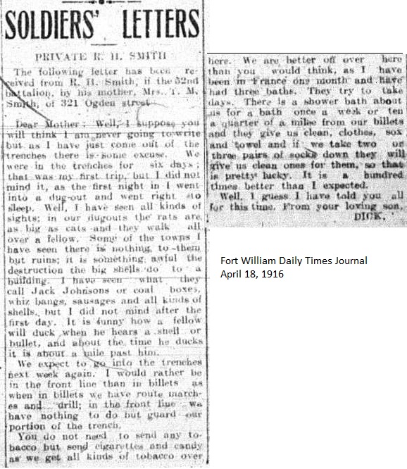 The Fort William Daily Times Journal and the Port Arthur Daily News respectfully solicited letters from soldiers at the front – or extracts therefrom – during the First World War. Any reader who had a letter from a relative or friend with the British, French or Russian forces was invited to submit said letter for publication to the community.