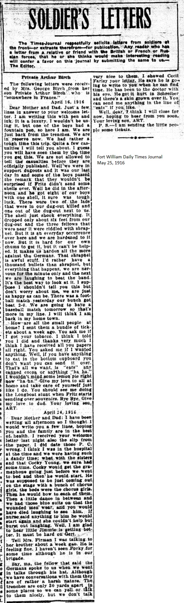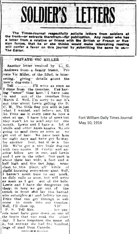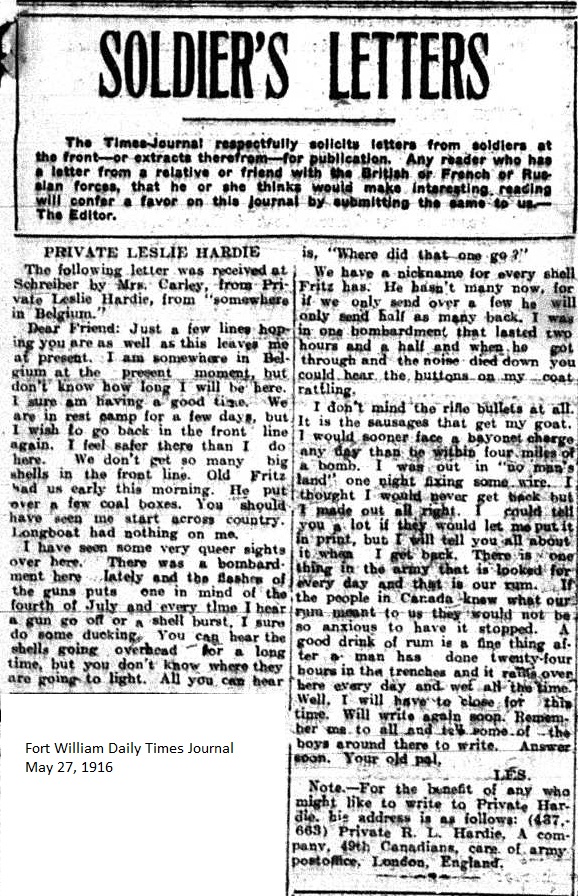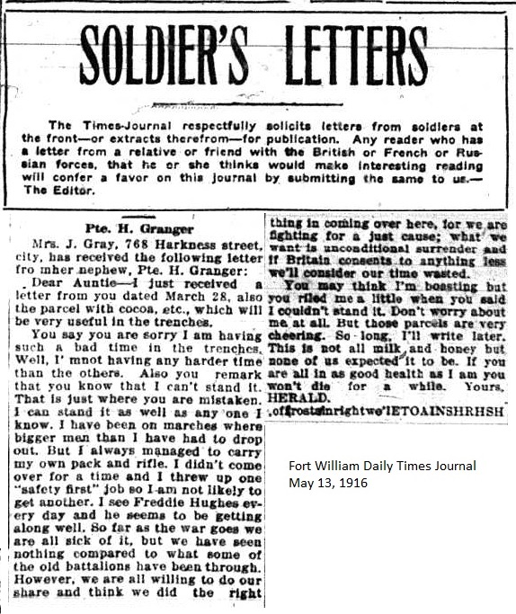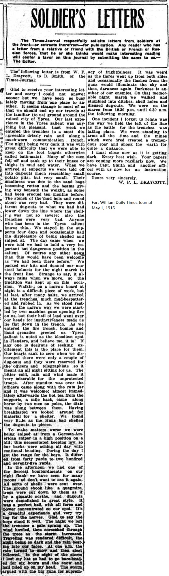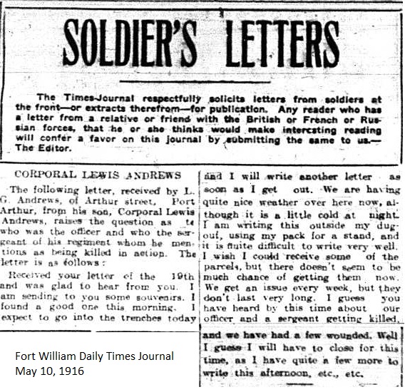 The Fort William Daily Times Journal and the Port Arthur Daily News respectfully solicited letters from soldiers at the front – or extracts therefrom – during the First World War. Any reader who had a letter from a relative or friend with the British, French or Russian forces was invited to submit said letter for publication to the community.