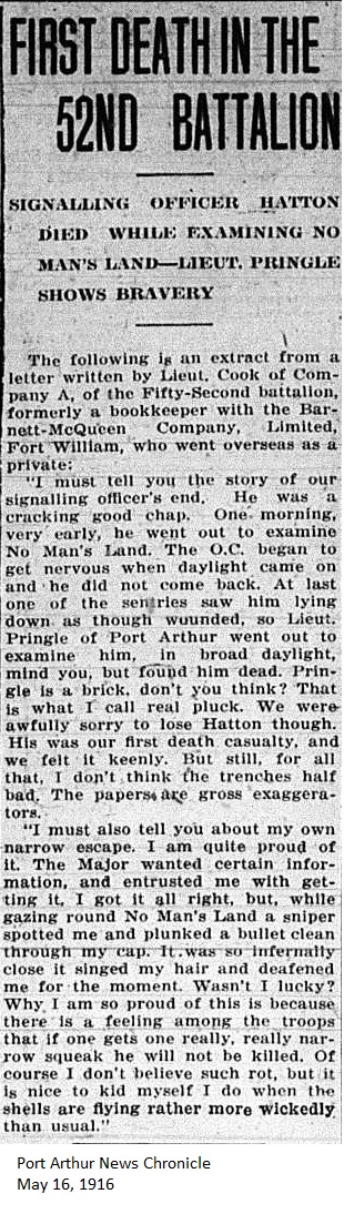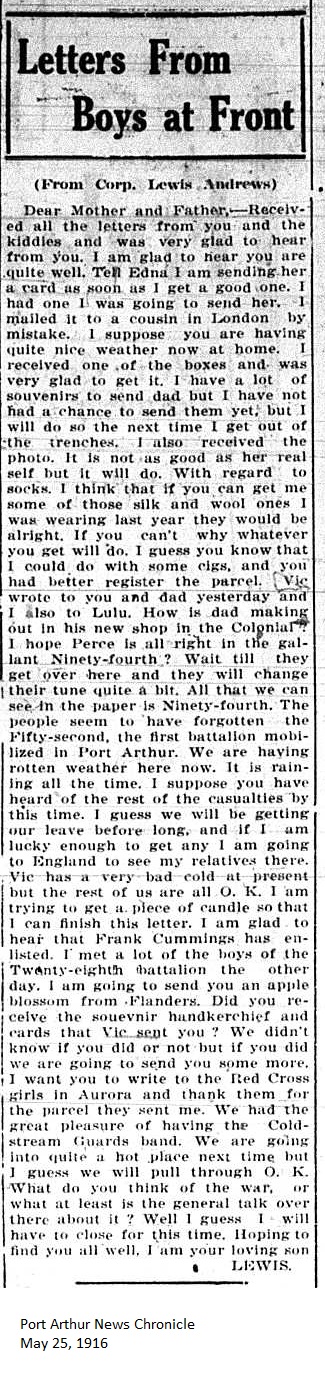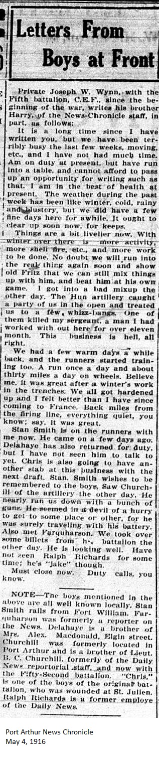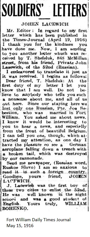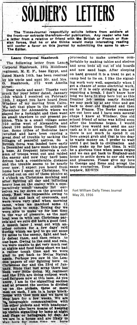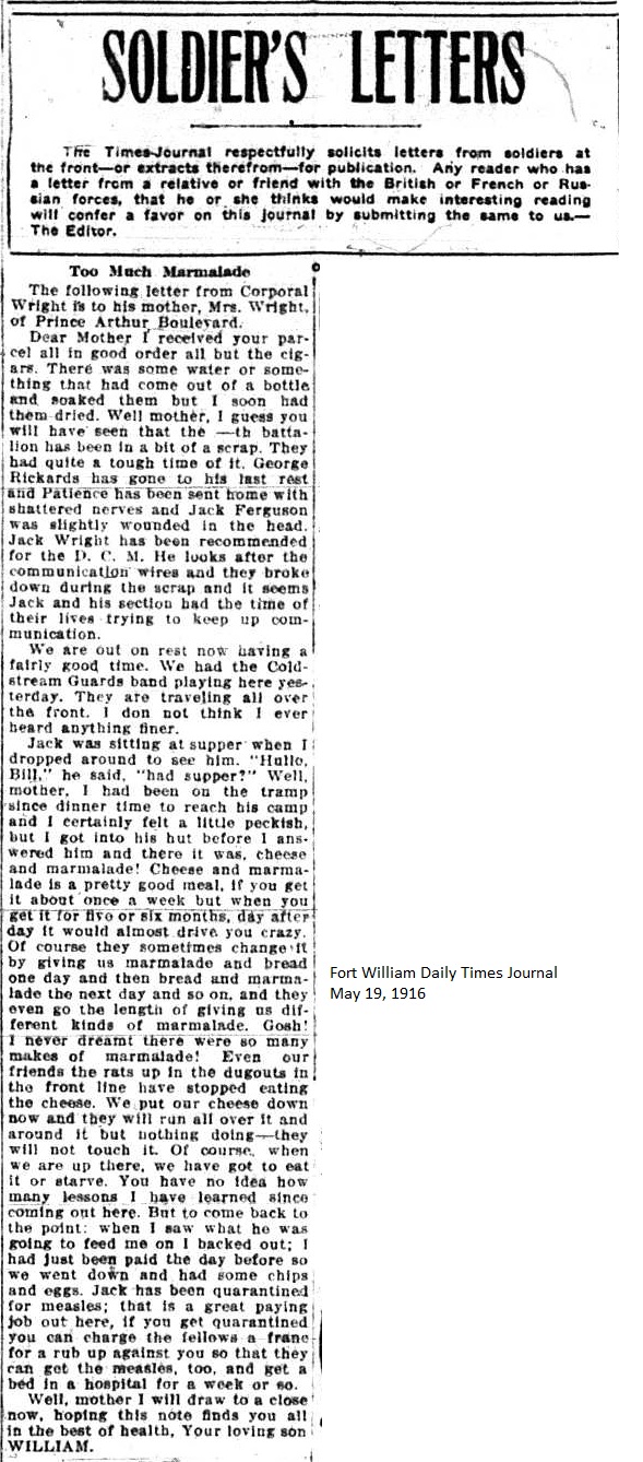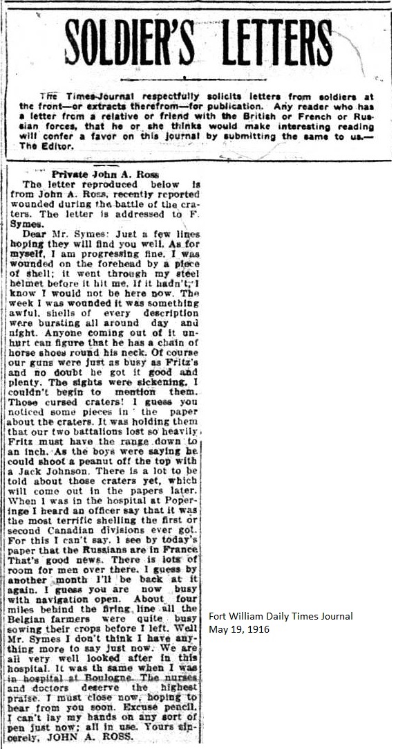 The Fort William Daily Times Journal and the Port Arthur Daily News respectfully solicited letters from soldiers at the front – or extracts therefrom – during the First World War. Any reader who had a letter from a relative or friend with the British, French or Russian forces was invited to submit said letter for publication to the community.