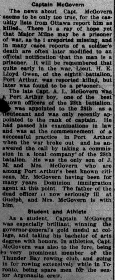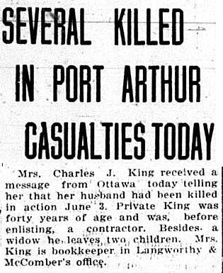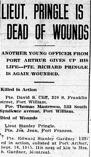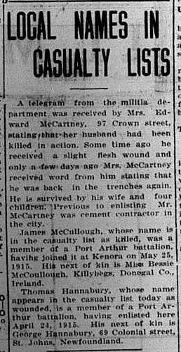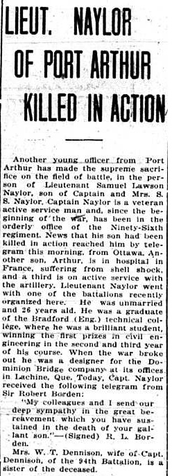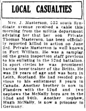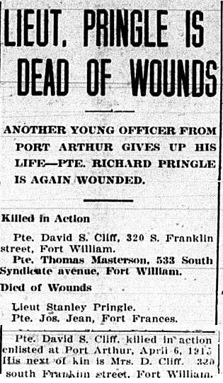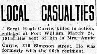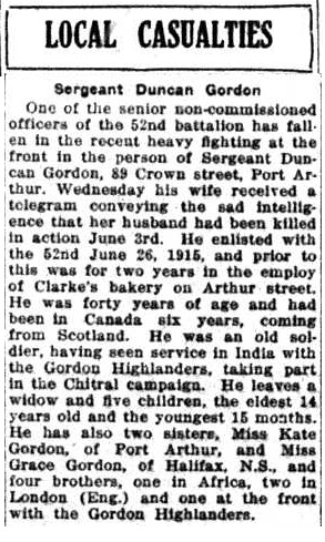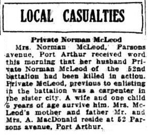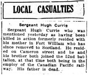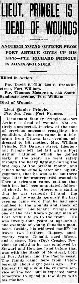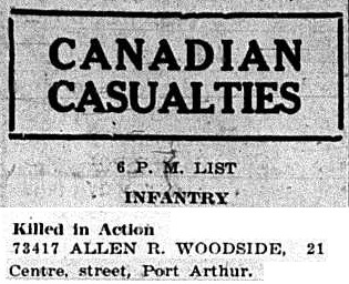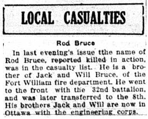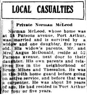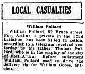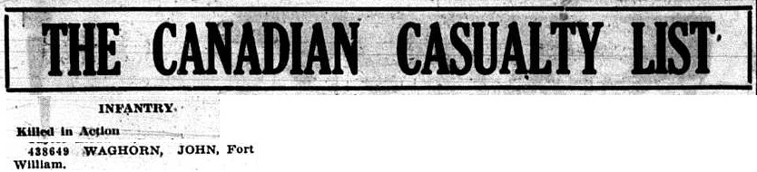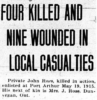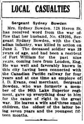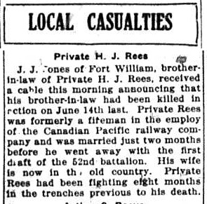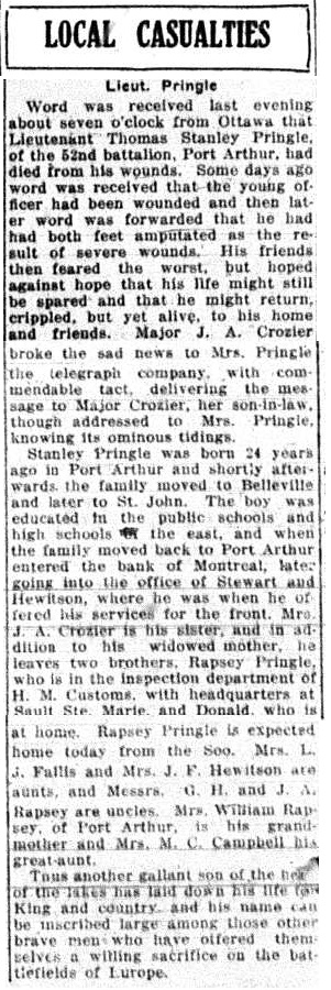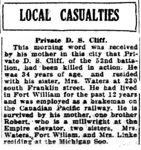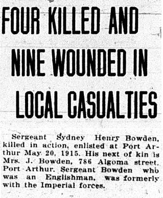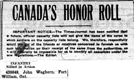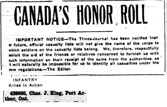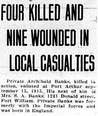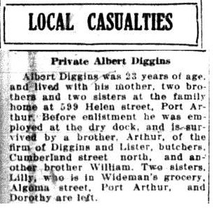 The above index contains published death notices from the Fort William Daily Times Journal (FWDTJ) and the Port Arthur Daily News (PADN), along with links to available attestation papers (through Library and Archives Canada) and Burial Records (through the Commonwealth War Graves Commission) for local individuals who were killed during or as a result of the First World War. The index is updated monthly to coincide with the centennial of these events and commemorate the sacrifice of those individuals and their families. If you know of someone who should be included here, please contact us at ww1project@tbpl.ca.