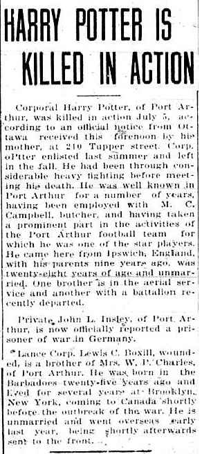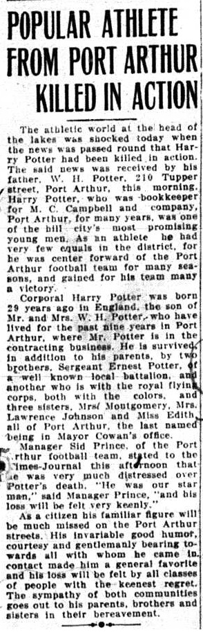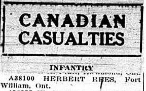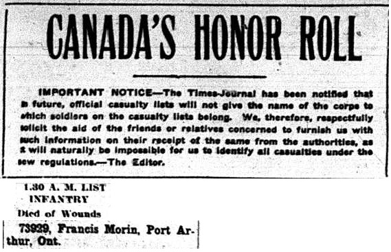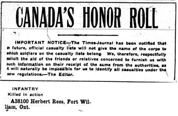 The above index contains published death notices from the Fort William Daily Times Journal (FWDTJ) and the Port Arthur Daily News (PADN), along with links to available attestation papers (through Library and Archives Canada) and Burial Records (through the Commonwealth War Graves Commission) for local individuals who were killed during or as a result of the First World War. The index is updated monthly to coincide with the centennial of these events and commemorate the sacrifice of those individuals and their families. If you know of someone who should be included here, please contact us at ww1project@tbpl.ca.
