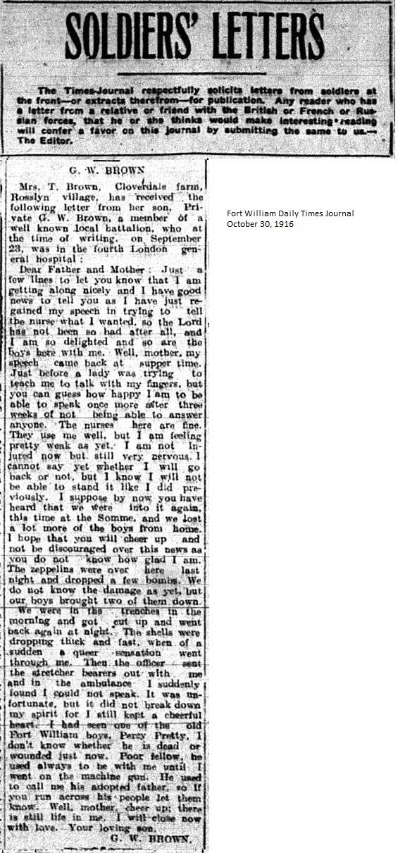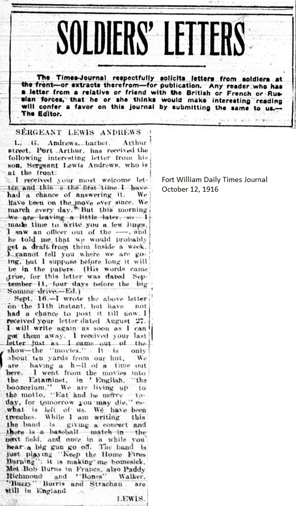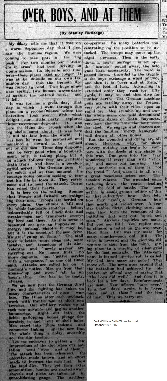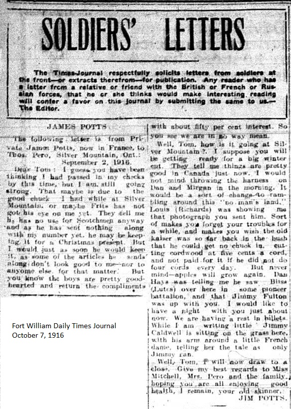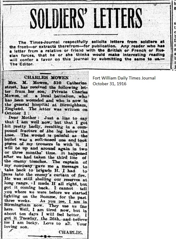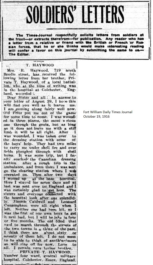The Fort William Daily Times Journal and the Port Arthur Daily News respectfully solicited letters from soldiers at the front – or extracts therefrom – during the First World War. Any reader who had a letter from a relative or friend with the British, French or Russian forces was invited to submit said letter for publication to the community.