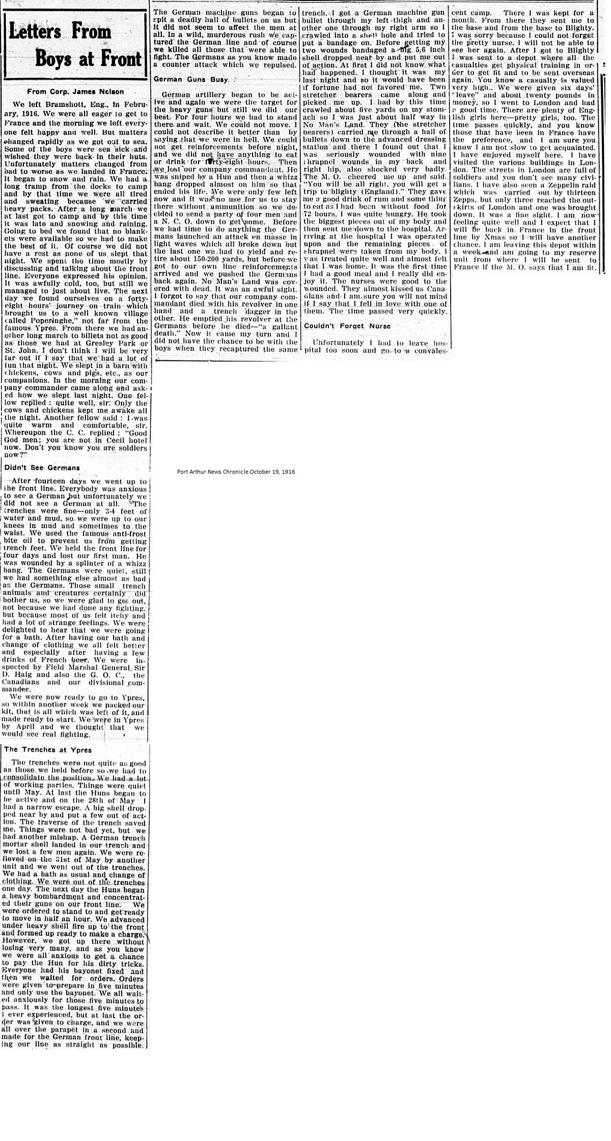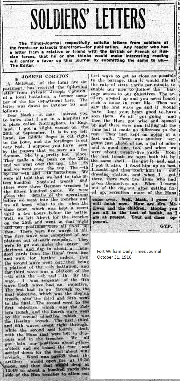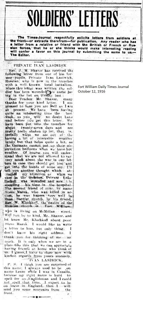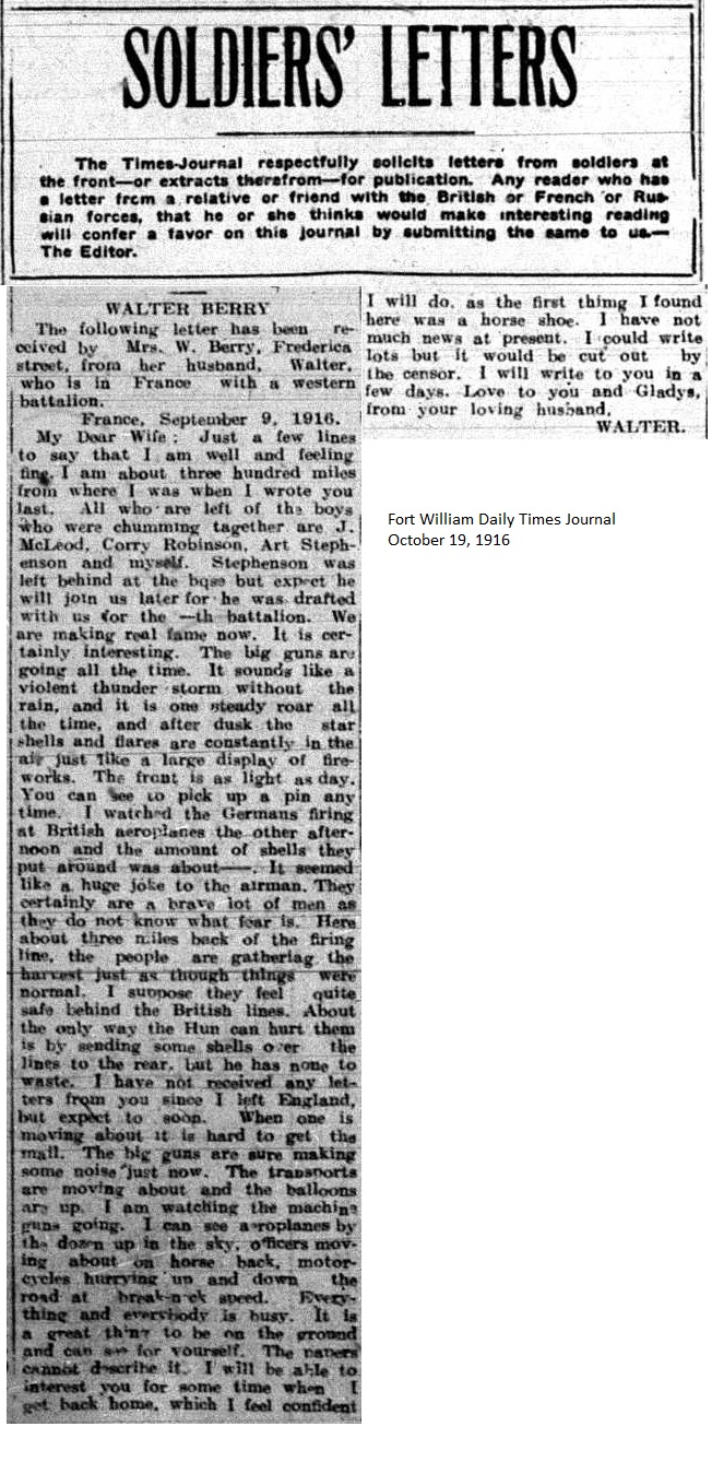 The Fort William Daily Times Journal and the Port Arthur Daily News respectfully solicited letters from soldiers at the front – or extracts therefrom – during the First World War. Any reader who had a letter from a relative or friend with the British, French or Russian forces was invited to submit said letter for publication to the community.