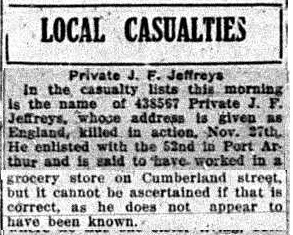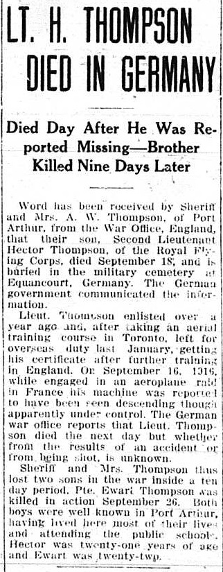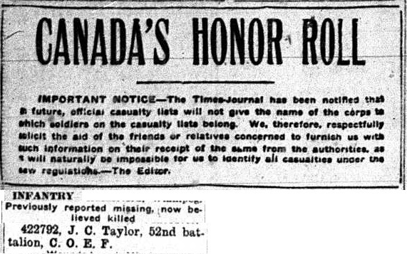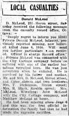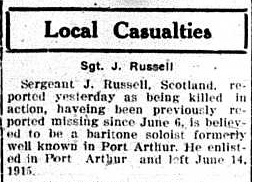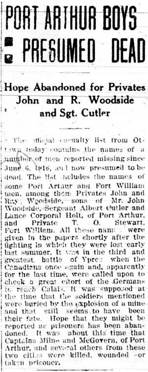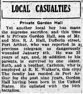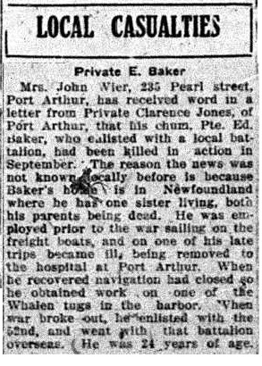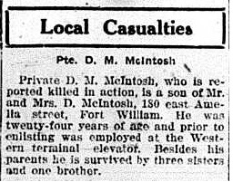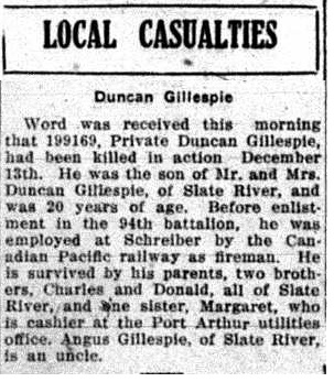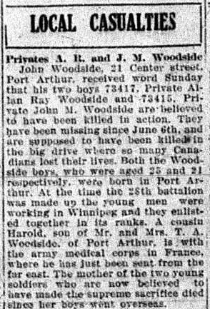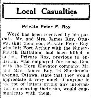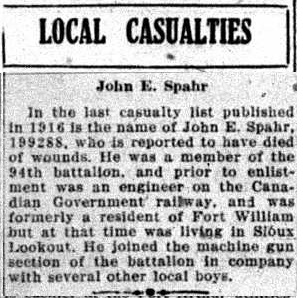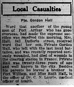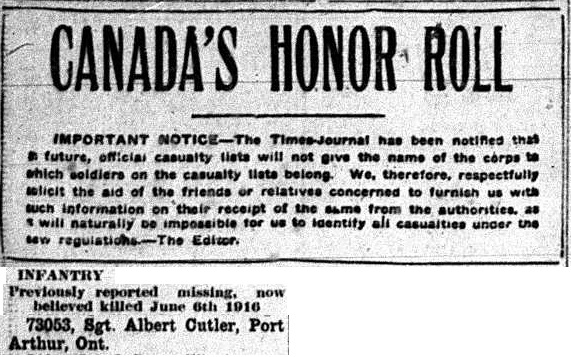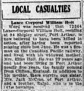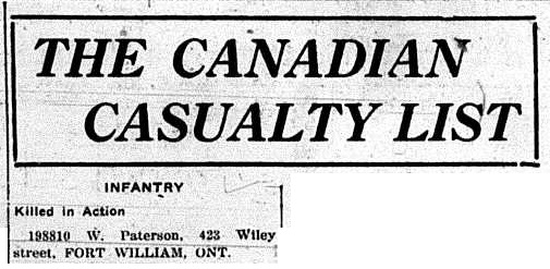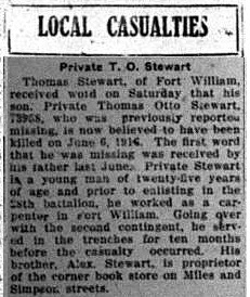 The above index contains published death notices from the Fort William Daily Times Journal (FWDTJ) and the Port Arthur Daily News (PADN), along with links to available attestation papers (through Library and Archives Canada) and Burial Records (through the Commonwealth War Graves Commission) for local individuals who were killed during or as a result of the First World War. The index is updated monthly to coincide with the centennial of these events and commemorate the sacrifice of those individuals and their families. If you know of someone who should be included here, please contact us at ww1project@tbpl.ca.
