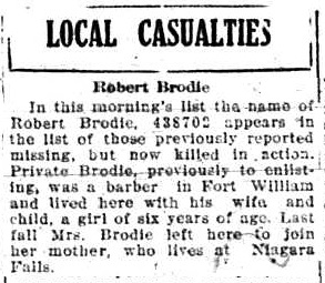 The above index contains published death notices from the Fort William Daily Times Journal (FWDTJ) and the Port Arthur Daily News (PADN), along with links to available attestation papers (through Library and Archives Canada) and Burial Records (through the Commonwealth War Graves Commission) for local individuals who were killed during or as a result of the First World War. The index is updated monthly to coincide with the centennial of these events and commemorate the sacrifice of those individuals and their families. If you know of someone who should be included here, please contact us at ww1project@tbpl.ca.