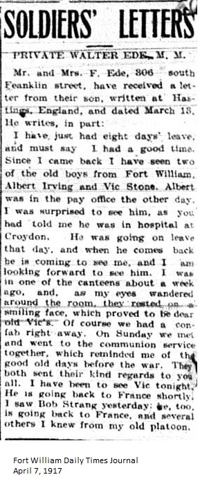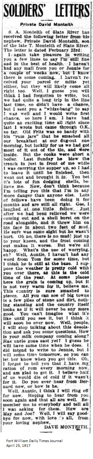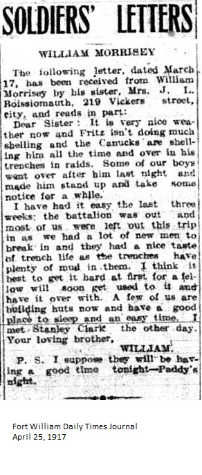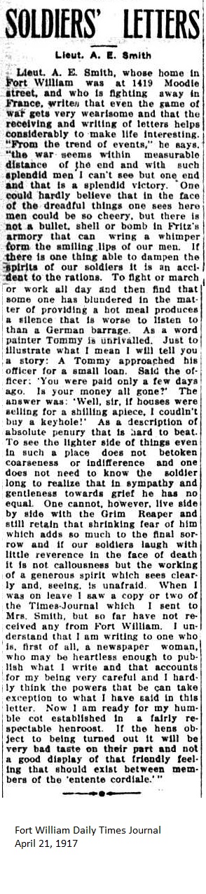 The Fort William Daily Times Journal and the Port Arthur Daily News respectfully solicited letters from soldiers at the front – or extracts therefrom – during the First World War. Any reader who had a letter from a relative or friend with the British, French or Russian forces was invited to submit said letter for publication to the community.