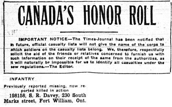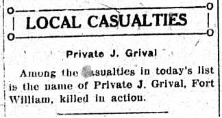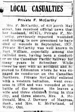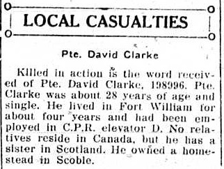 The above index contains published death notices from the Fort William Daily Times Journal (FWDTJ) and the Port Arthur Daily News (PADN), along with links to available attestation papers (through Library and Archives Canada) and Burial Records (through the Commonwealth War Graves Commission) for local individuals who were killed during or as a result of the First World War. The index is updated monthly to coincide with the centennial of these events and commemorate the sacrifice of those individuals and their families. If you know of someone who should be included here, please contact us at ww1project@tbpl.ca.