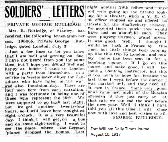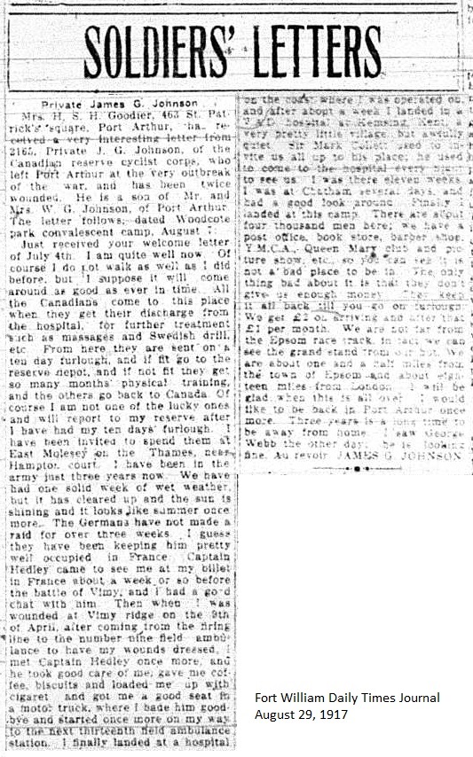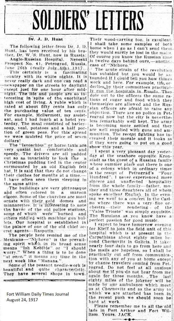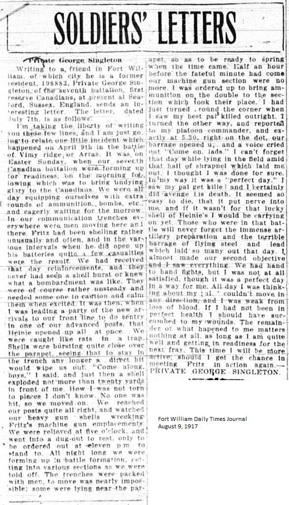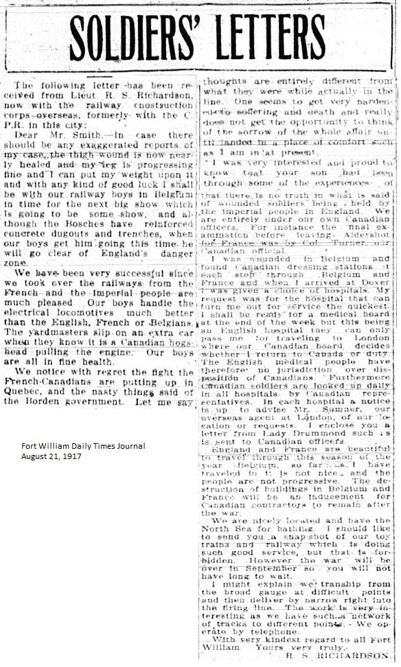 The Fort William Daily Times Journal and the Port Arthur Daily News respectfully solicited letters from soldiers at the front – or extracts therefrom – during the First World War. Any reader who had a letter from a relative or friend with the British, French or Russian forces was invited to submit said letter for publication to the community.
