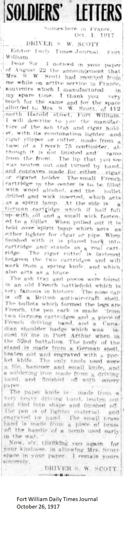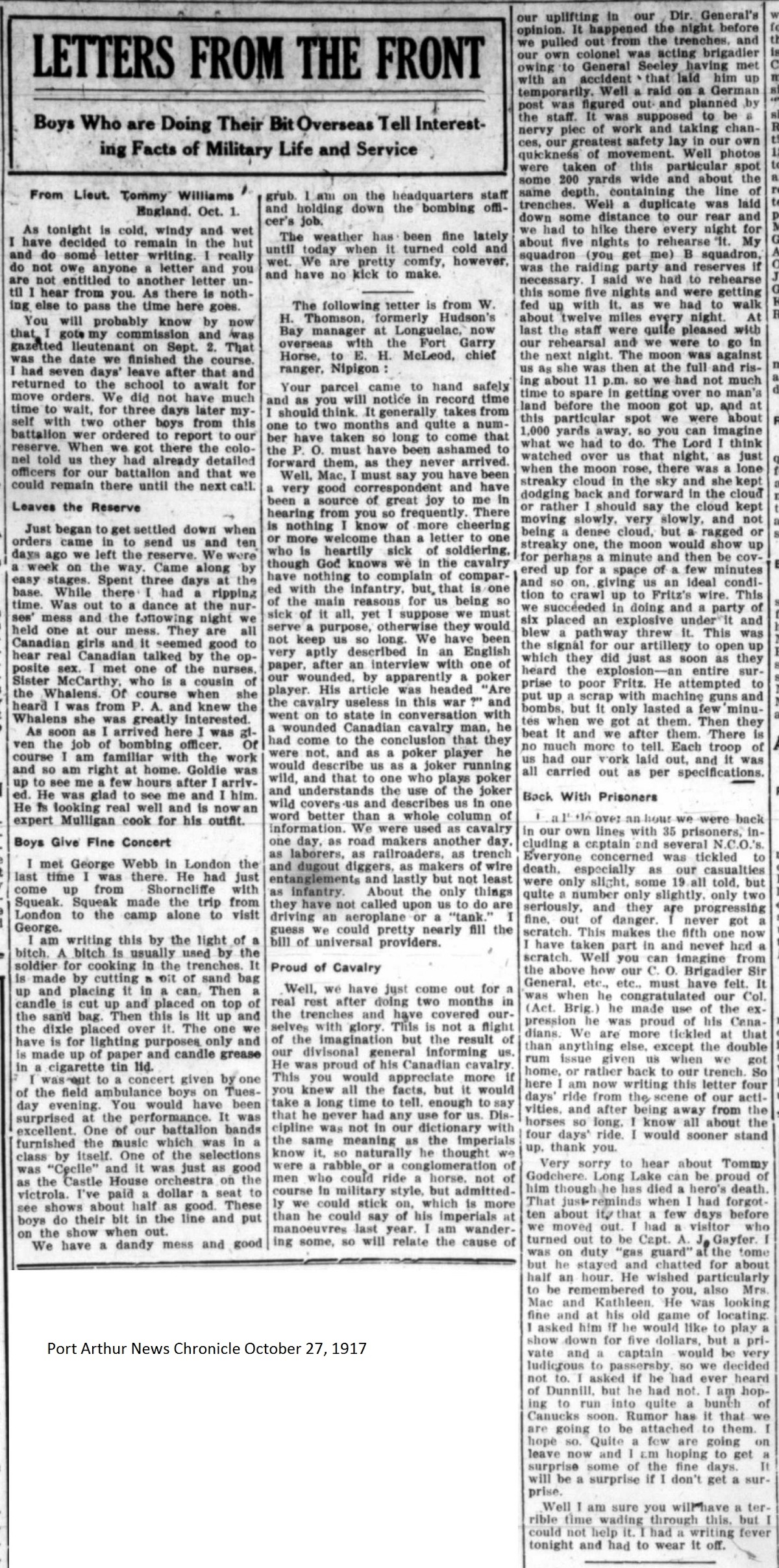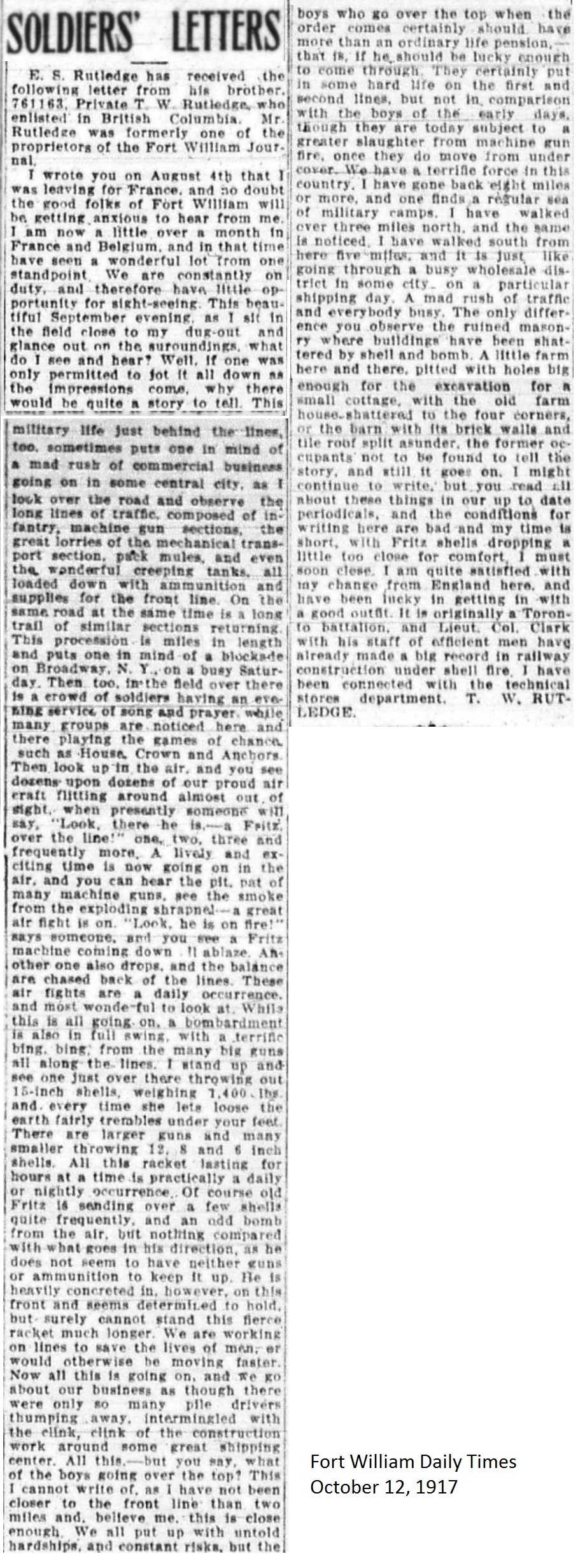 The Fort William Daily Times Journal and the Port Arthur Daily News respectfully solicited letters from soldiers at the front – or extracts therefrom – during the First World War. Any reader who had a letter from a relative or friend with the British, French or Russian forces was invited to submit said letter for publication to the community.