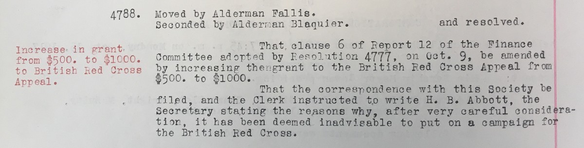 Port Arthur approved the grant of $500.00 or $8,156.25 in Canadian Dollars today to the British Red Cross (above) but was asked to increase the amount that they were willing to grant them from $500 to $1000 or the equivalent to $16,312.50 today. They agreed to the increase in funds, but declined to conduct a full fundraising campaign for the organization, deeming it “inadvisable”.