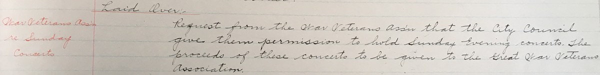 Fort William City Council was asked if they would allow the War Veterans association to hold Sunday concerts with the profits being given to the War Veterans Association. They have not made a decision and have decided to lay it over until later.