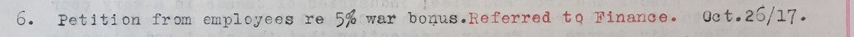 On August 14th, Fort William City Council granted a 10% war bonus to an employee in a Superintendent position. It is still unclear as to exactly what a “war bonus” was, but it may have been a bonus for staying with the City in an essential service when he could have left and enlisted in the war. Here the employees of the City of Port Arthur have petitioned for a 5% war bonus. It has been referred to the Finance Committee for further discussion.