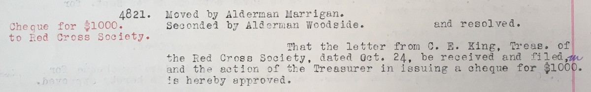 Here Port Arthur City Council gives the Red Cross Society $1000. This was the Canadian organization, paid from the general City funds, and not the British Red Cross whom they were funding from the Patriotic Levy (October 15, above).