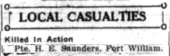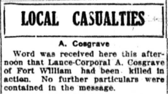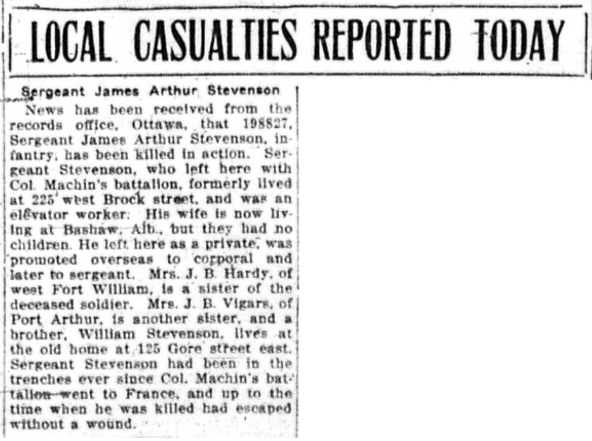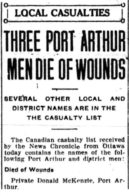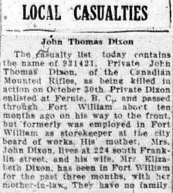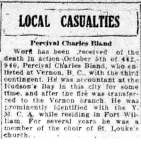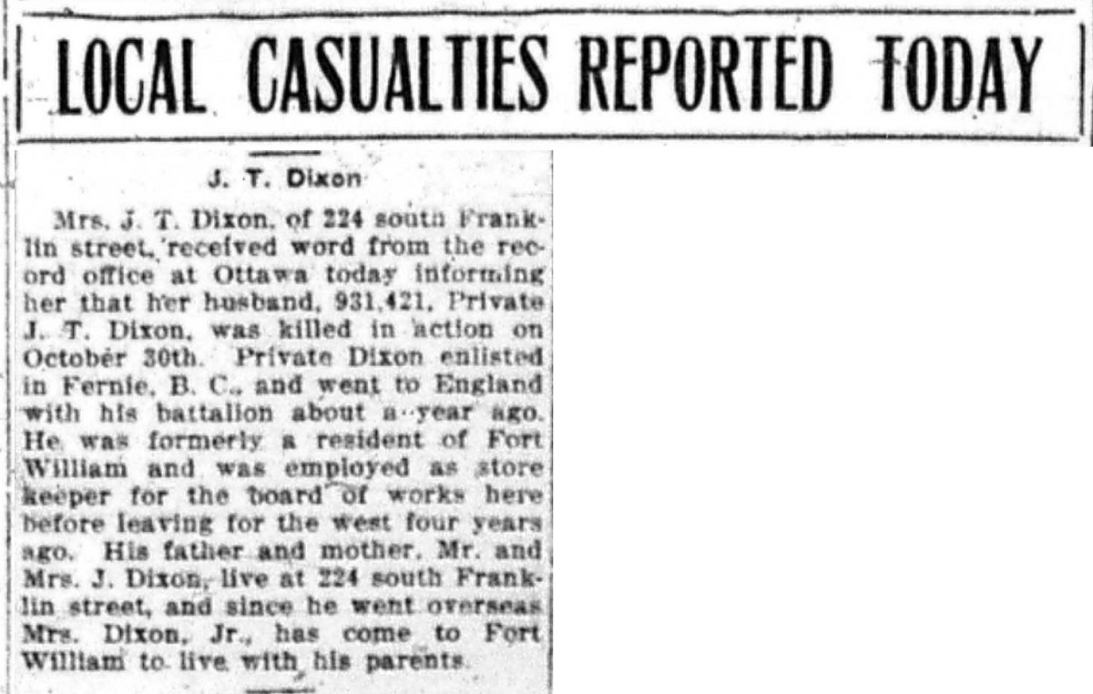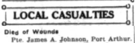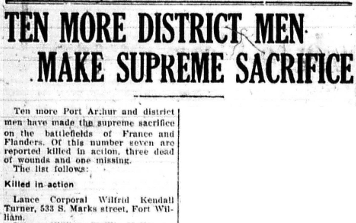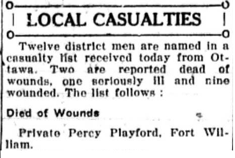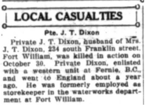 The above index contains published death notices from the Fort William Daily Times Journal (FWDTJ) and the Port Arthur Daily News (PADN), along with links to available attestation papers (through Library and Archives Canada) and Burial Records (through the Commonwealth War Graves Commission) for local individuals who were killed during or as a result of the First World War. The index is updated monthly to coincide with the centennial of these events and commemorate the sacrifice of those individuals and their families. If you know of someone who should be included here, please contact us at ww1project@tbpl.ca.
