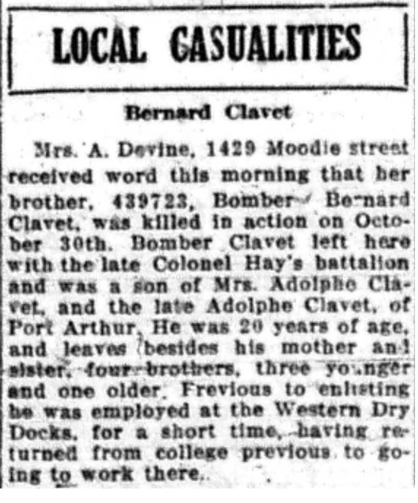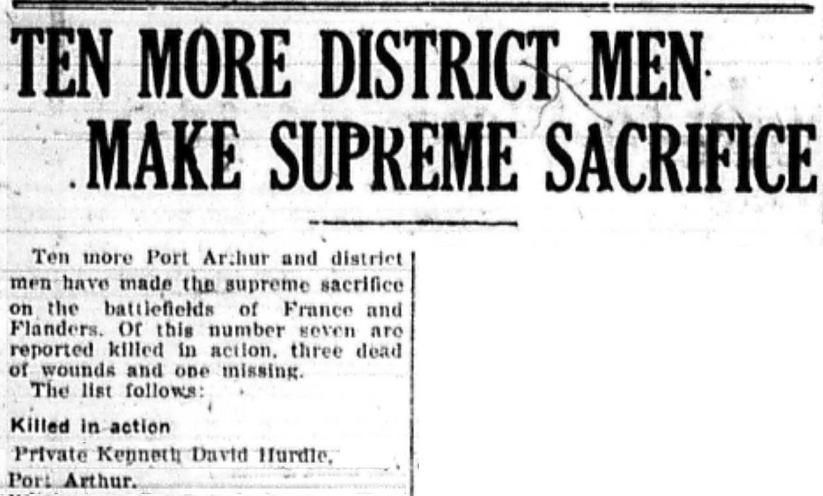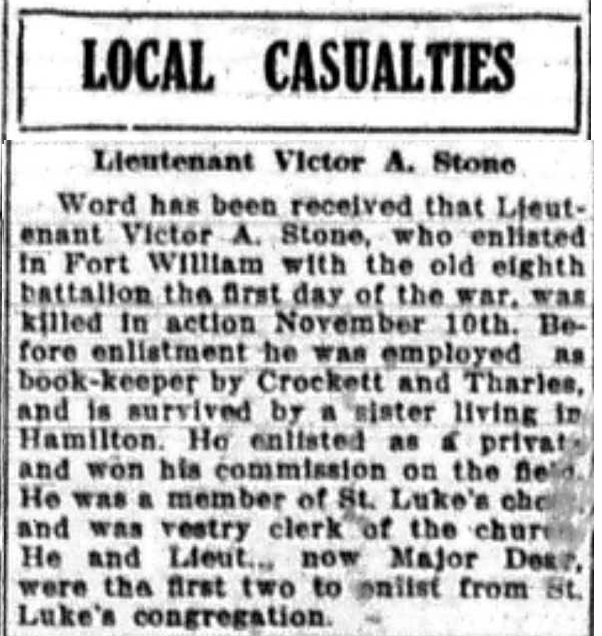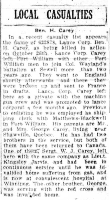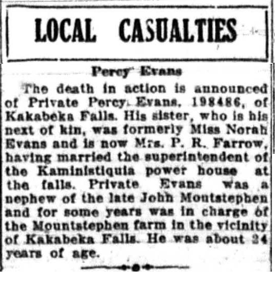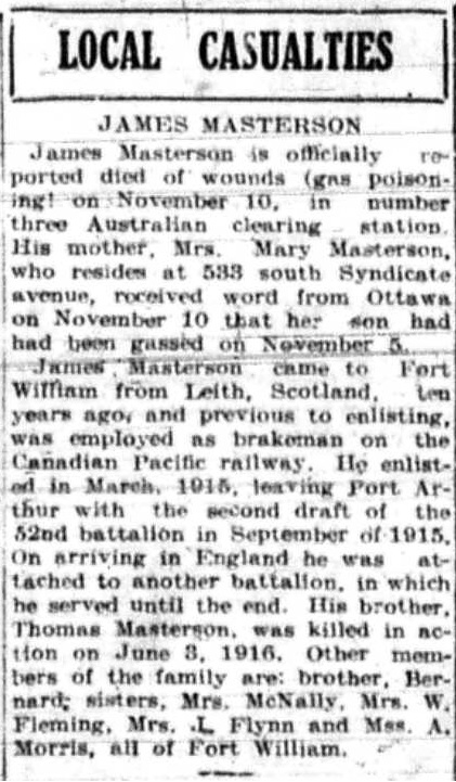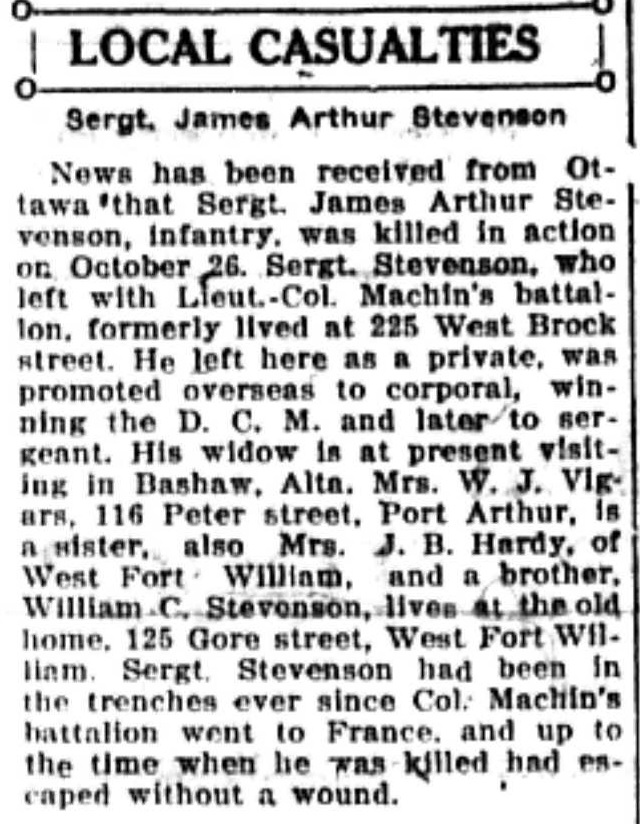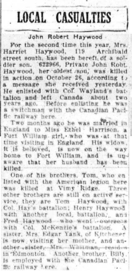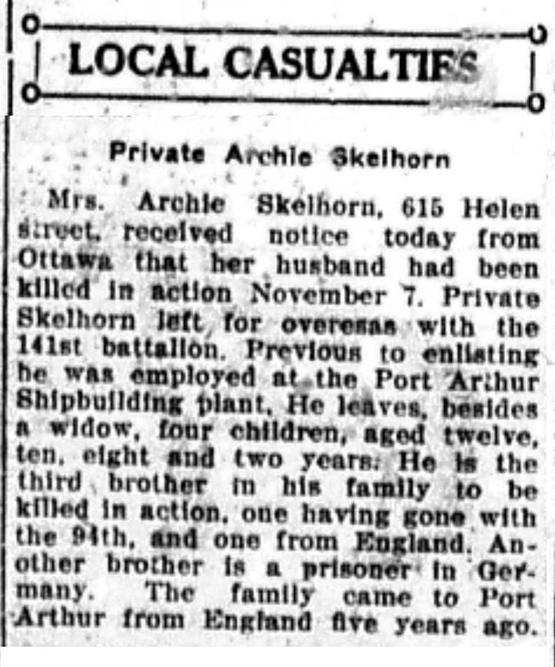 The above index contains published death notices from the Fort William Daily Times Journal (FWDTJ) and the Port Arthur Daily News (PADN), along with links to available attestation papers (through Library and Archives Canada) and Burial Records (through the Commonwealth War Graves Commission) for local individuals who were killed during or as a result of the First World War. The index is updated monthly to coincide with the centennial of these events and commemorate the sacrifice of those individuals and their families. If you know of someone who should be included here, please contact us at ww1project@tbpl.ca.