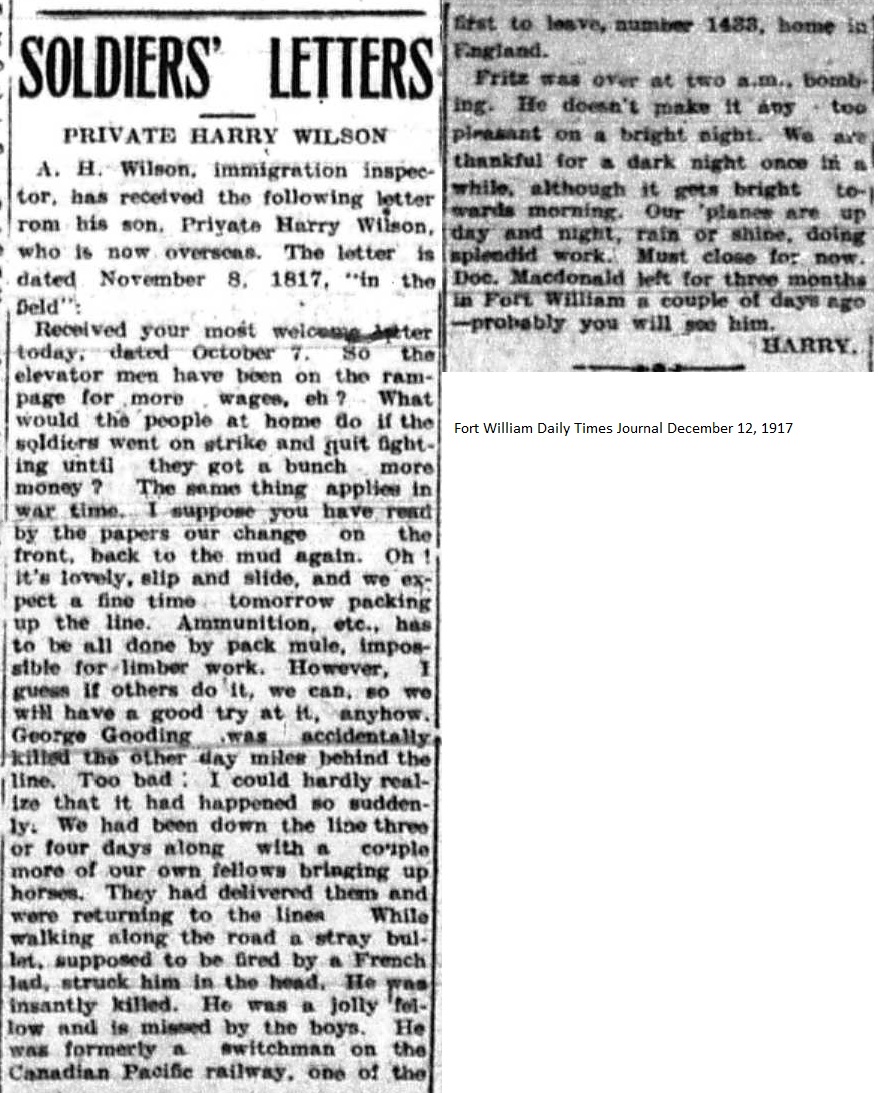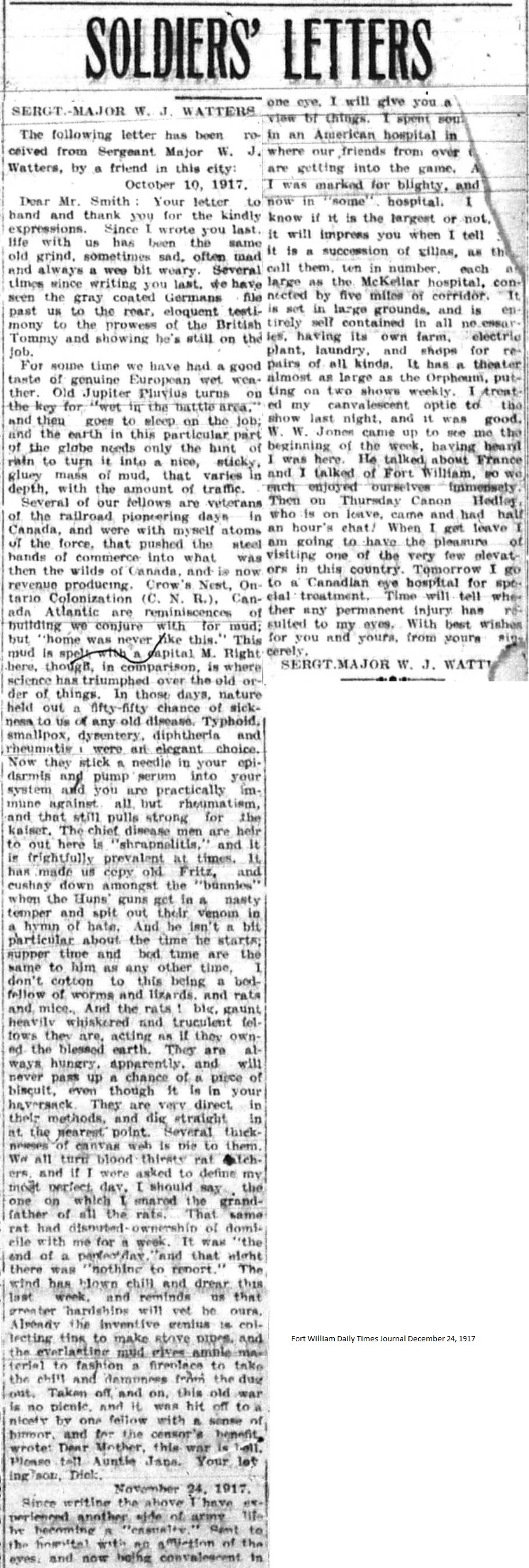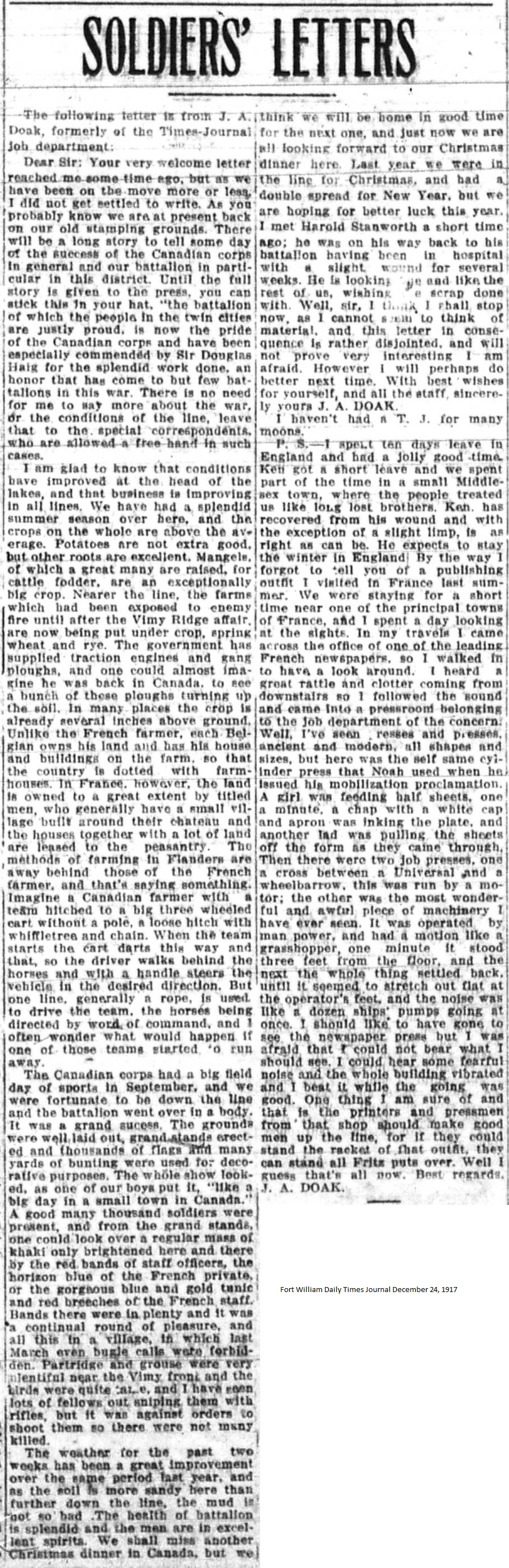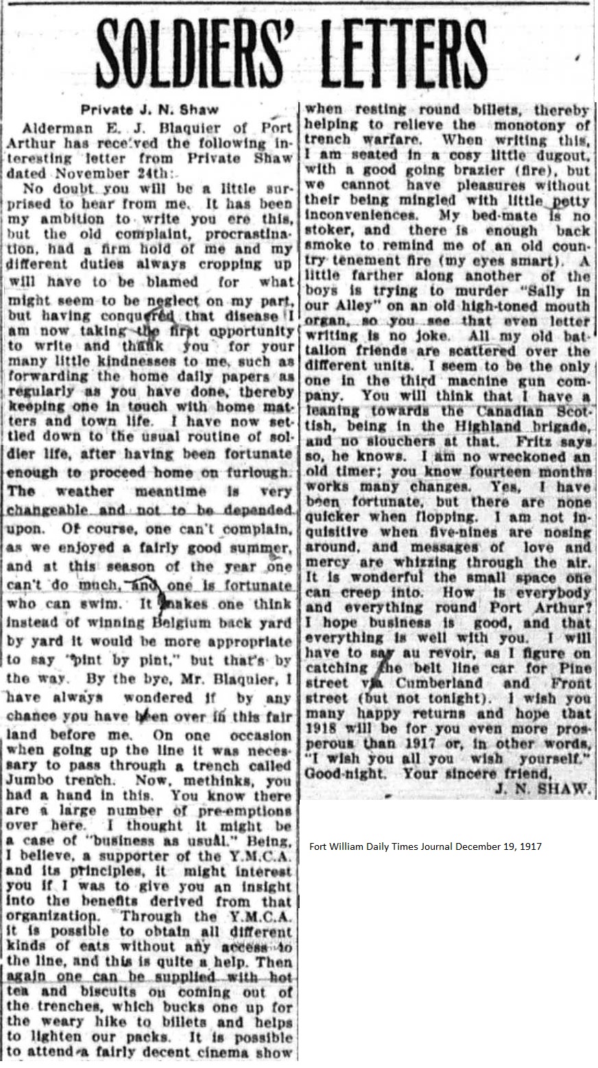 The Fort William Daily Times Journal and the Port Arthur Daily News respectfully solicited letters from soldiers at the front – or extracts therefrom – during the First World War. Any reader who had a letter from a relative or friend with the British, French or Russian forces was invited to submit said letter for publication to the community.
