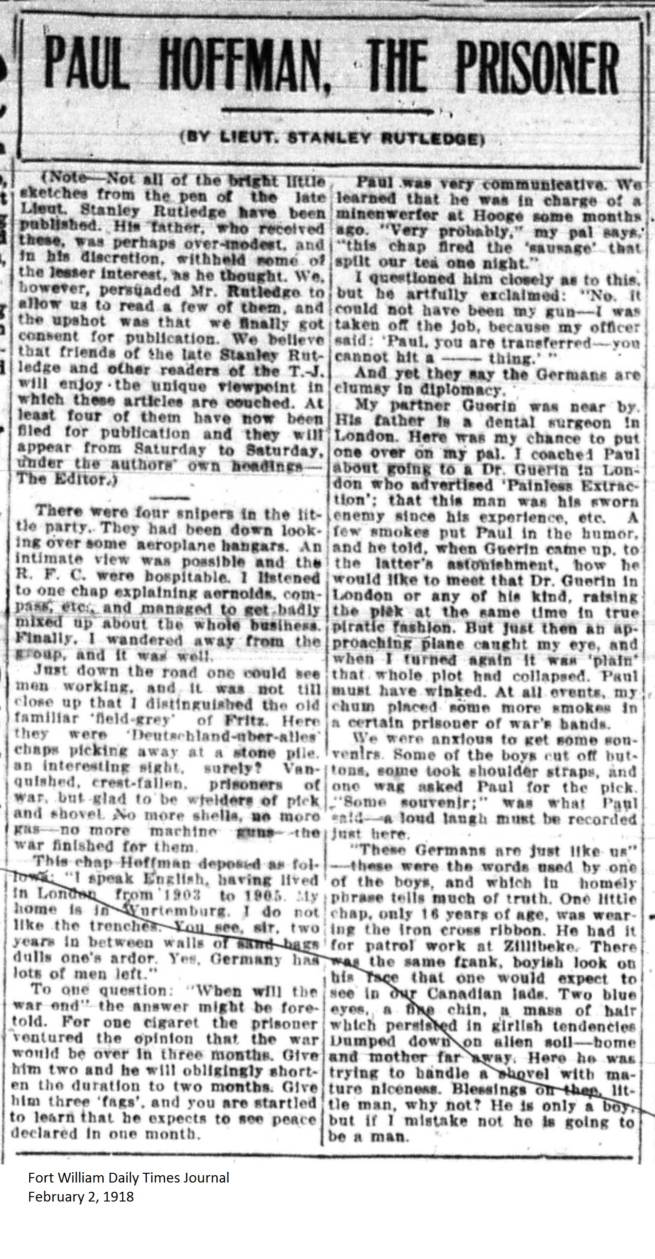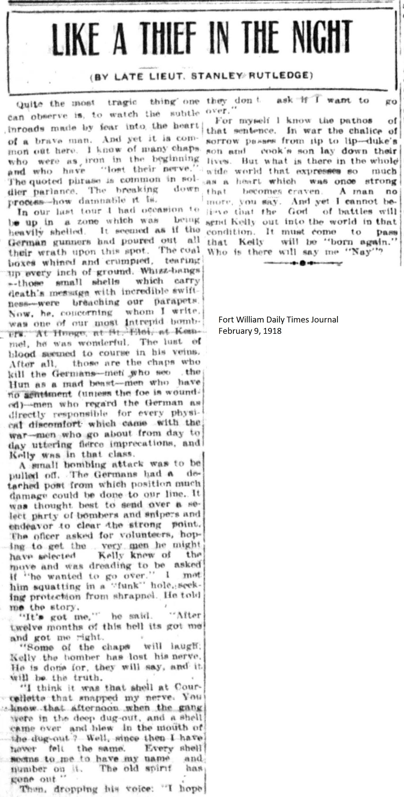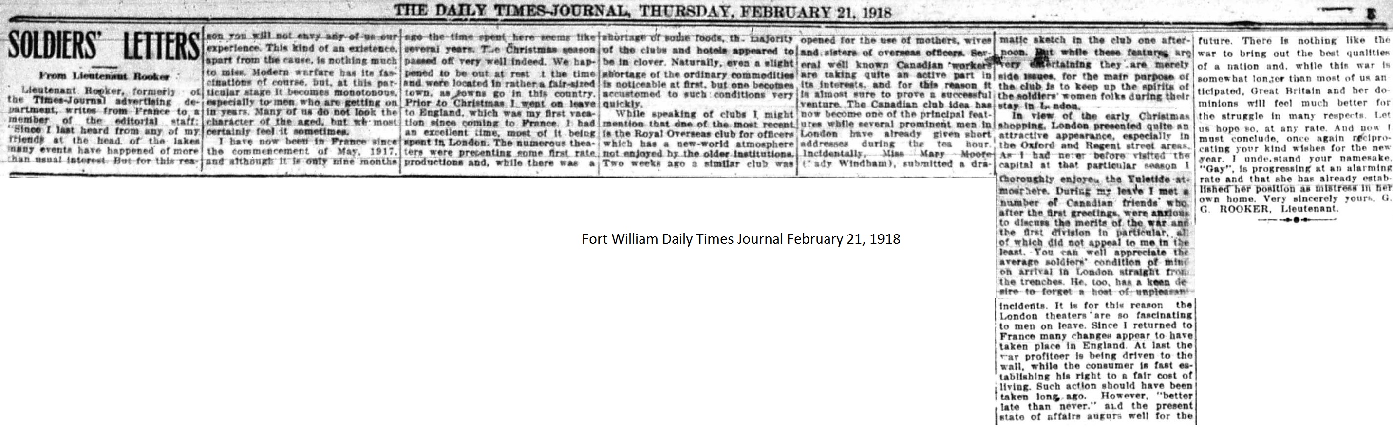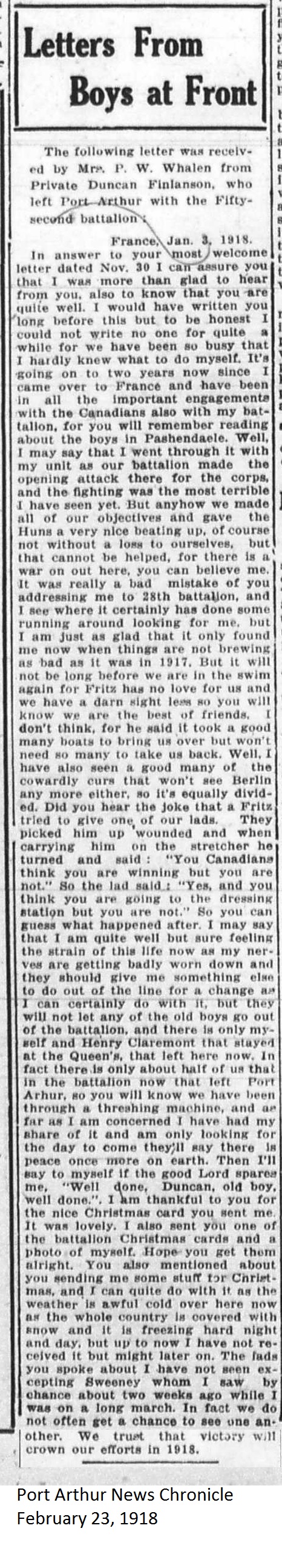 The Fort William Daily Times Journal and the Port Arthur Daily News respectfully solicited letters from soldiers at the front – or extracts therefrom – during the First World War. Any reader who had a letter from a relative or friend with the British, French or Russian forces was invited to submit said letter for publication to the community.