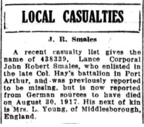 The above index contains published death notices from the Fort William Daily Times Journal (FWDTJ) and the Port Arthur Daily News (PADN), along with links to available attestation papers (through Library and Archives Canada) and Burial Records (through the Commonwealth War Graves Commission) for local individuals who were killed during or as a result of the First World War. The index is updated monthly to coincide with the centennial of these events and commemorate the sacrifice of those individuals and their families. If you know of someone who should be included here, please contact us at ww1project@tbpl.ca.