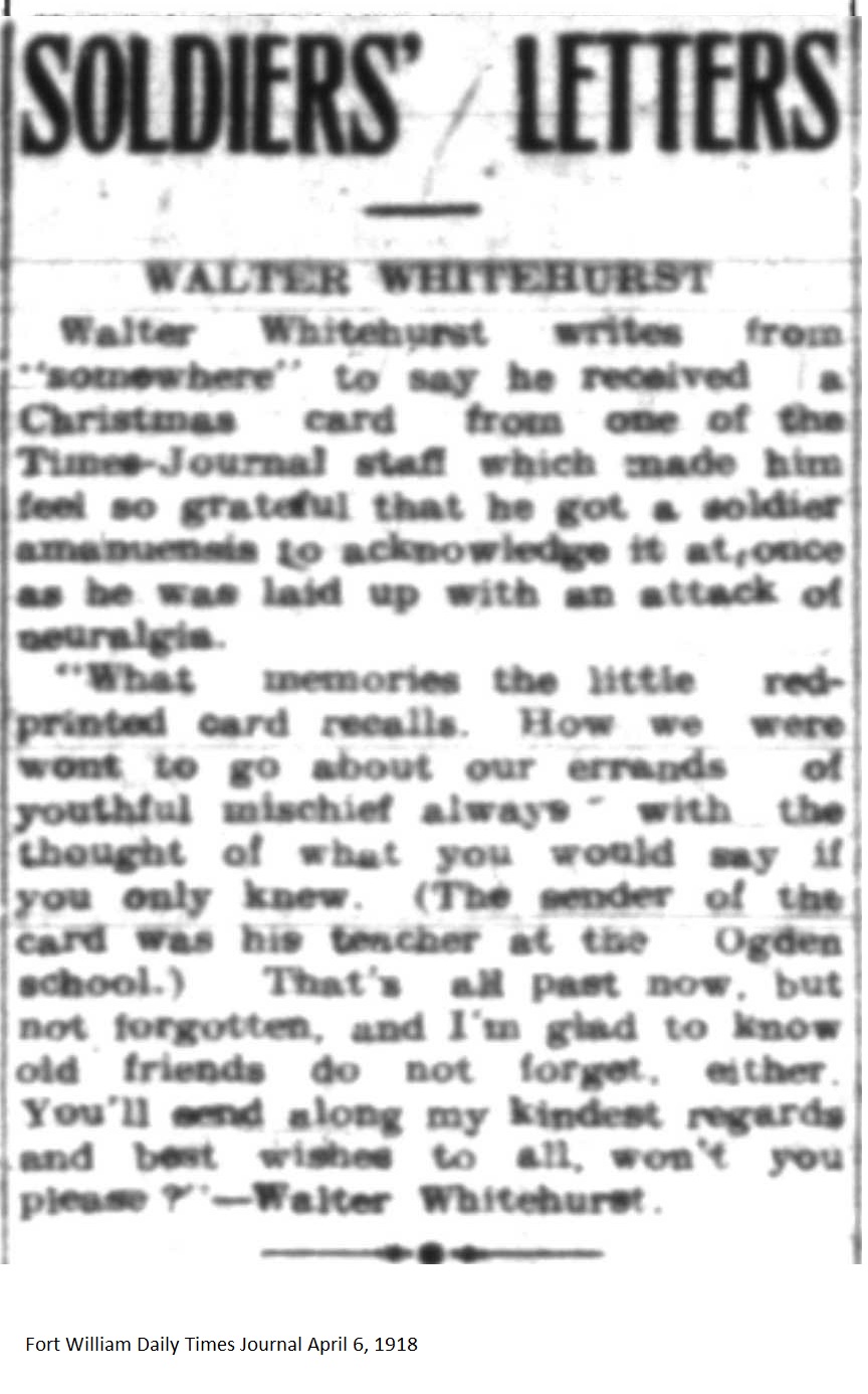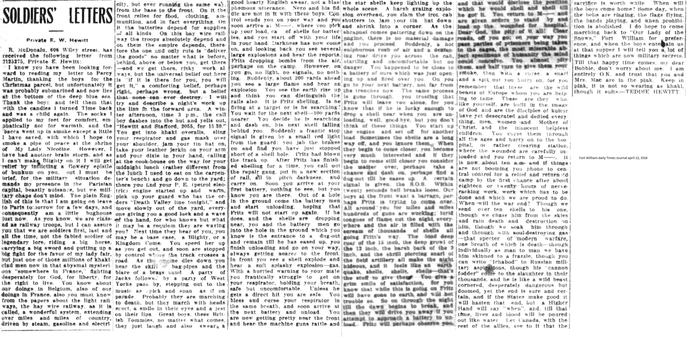 The Fort William Daily Times Journal and the Port Arthur Daily News respectfully solicited letters from soldiers at the front – or extracts therefrom – during the First World War. Any reader who had a letter from a relative or friend with the British, French or Russian forces was invited to submit said letter for publication to the community.