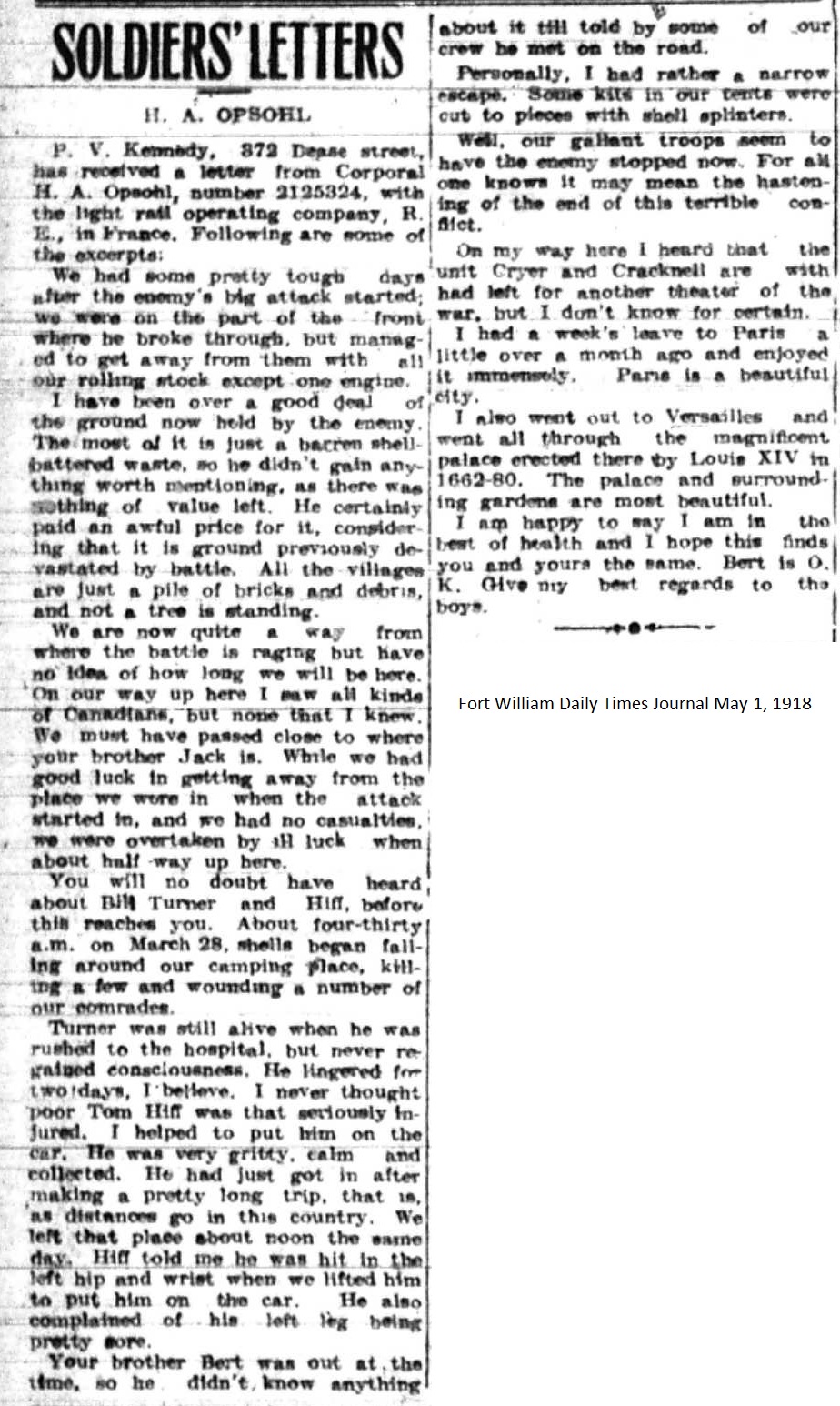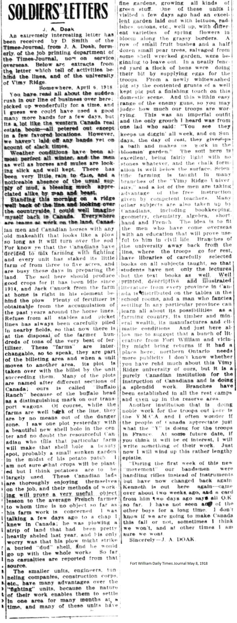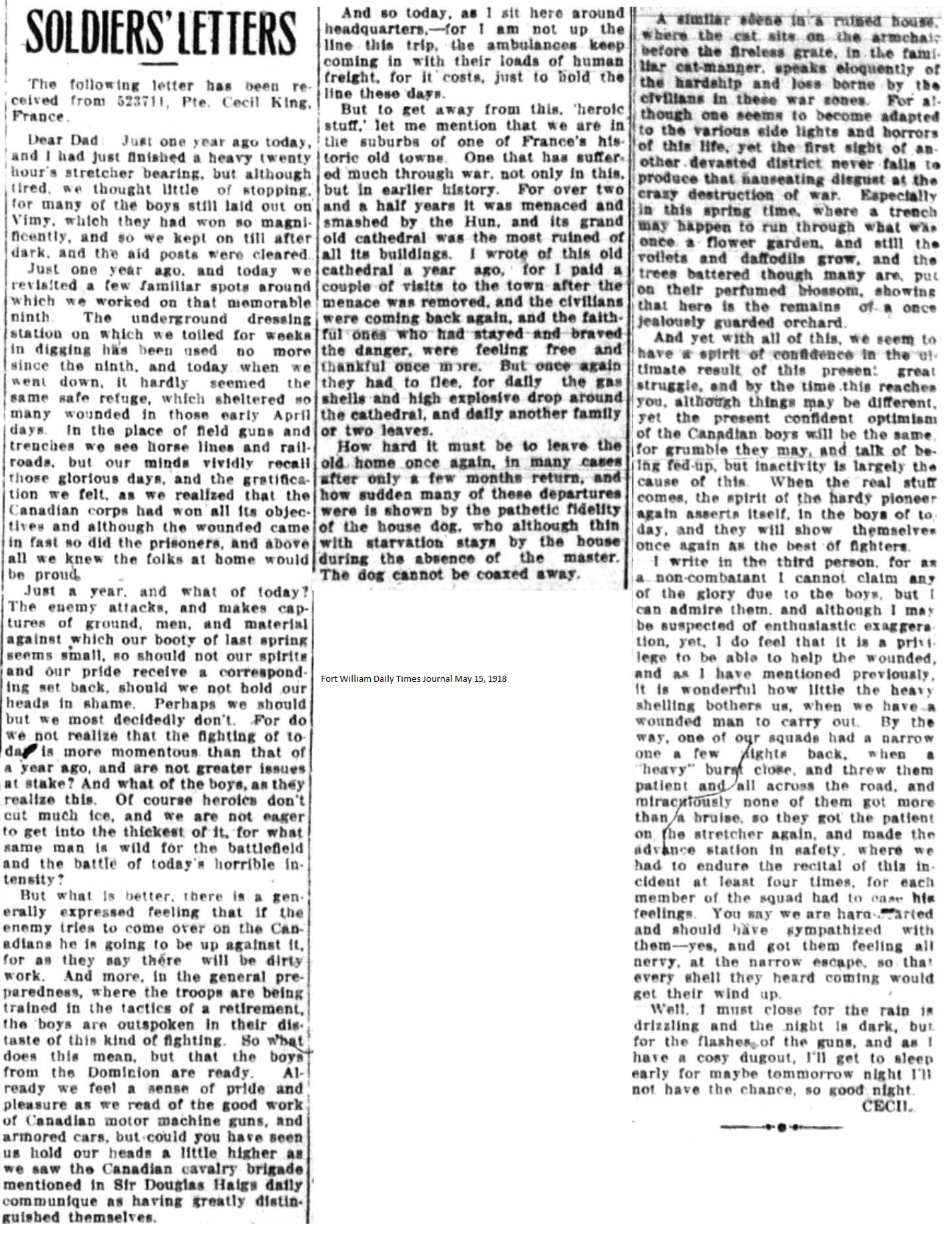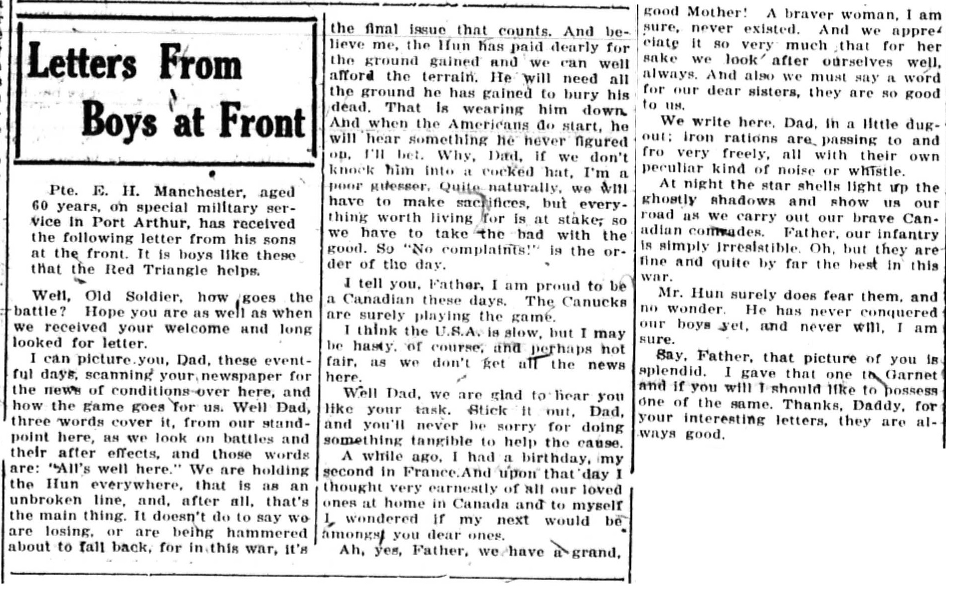 The Fort William Daily Times Journal and the Port Arthur Daily News respectfully solicited letters from soldiers at the front – or extracts therefrom – during the First World War. Any reader who had a letter from a relative or friend with the British, French or Russian forces was invited to submit said letter for publication to the community.