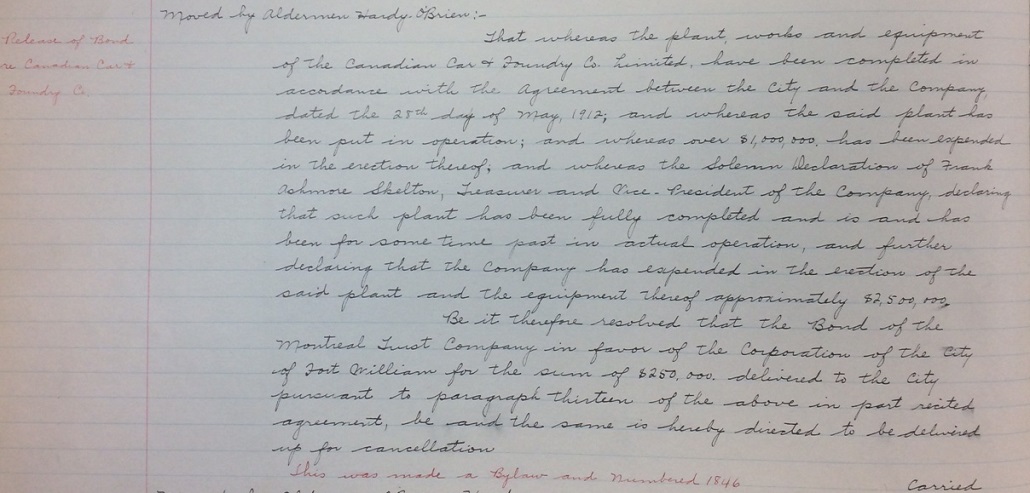 The City of Fort William had supported the development of Canadian Car and Foundry as an equipment foundry back in May 1912, which as of this meeting had just been finished. Since the plant was now fully operational, at the cost of $1,000,000 to the city and a further $2,500,000 to the company itself, Fort William asked that the bond requiring the company to pay out to the city $250,000 in the case of its failure to meet production targets be “delivered up for cancellation”.