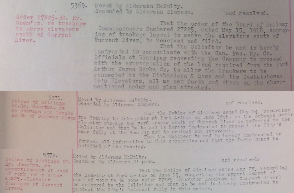 Grain shipments during the war had to be continued at great cost, and Port Arthur found itself embroiled in a legal dispute regarding connects made to elevators through spur lines south of Current River. The case involved the Canadian Pacific Railway Company and the Port Arthur Wagon works, and at this meeting City Council ensured that its solicitor would be present at negotiations to “protect the City’s interest fully in this matter”.