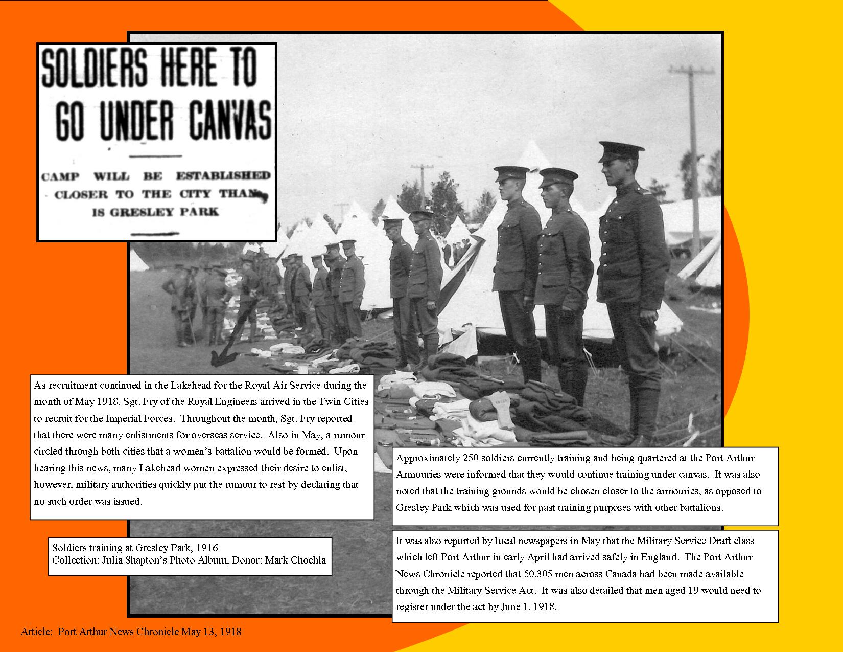 The City of Port Arthur had allowed the Great War Veterans Association to use the old Municipal Building at 242 Arthur St W, now Red River Road (this building no longer exists), as a meeting place in September 1917, and the military for recruiting. Here, a Sergeant Fry of the Royal Engineers was additionally allowed the use of a room in the building to use as a recruiting office.