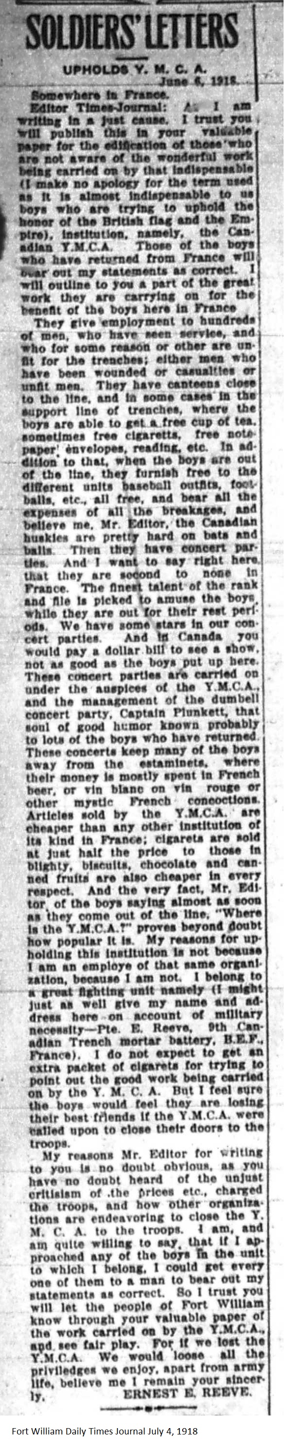 The Fort William Daily Times Journal and the Port Arthur Daily News respectfully solicited letters from soldiers at the front – or extracts therefrom – during the First World War. Any reader who had a letter from a relative or friend with the British, French or Russian forces was invited to submit said letter for publication to the community.