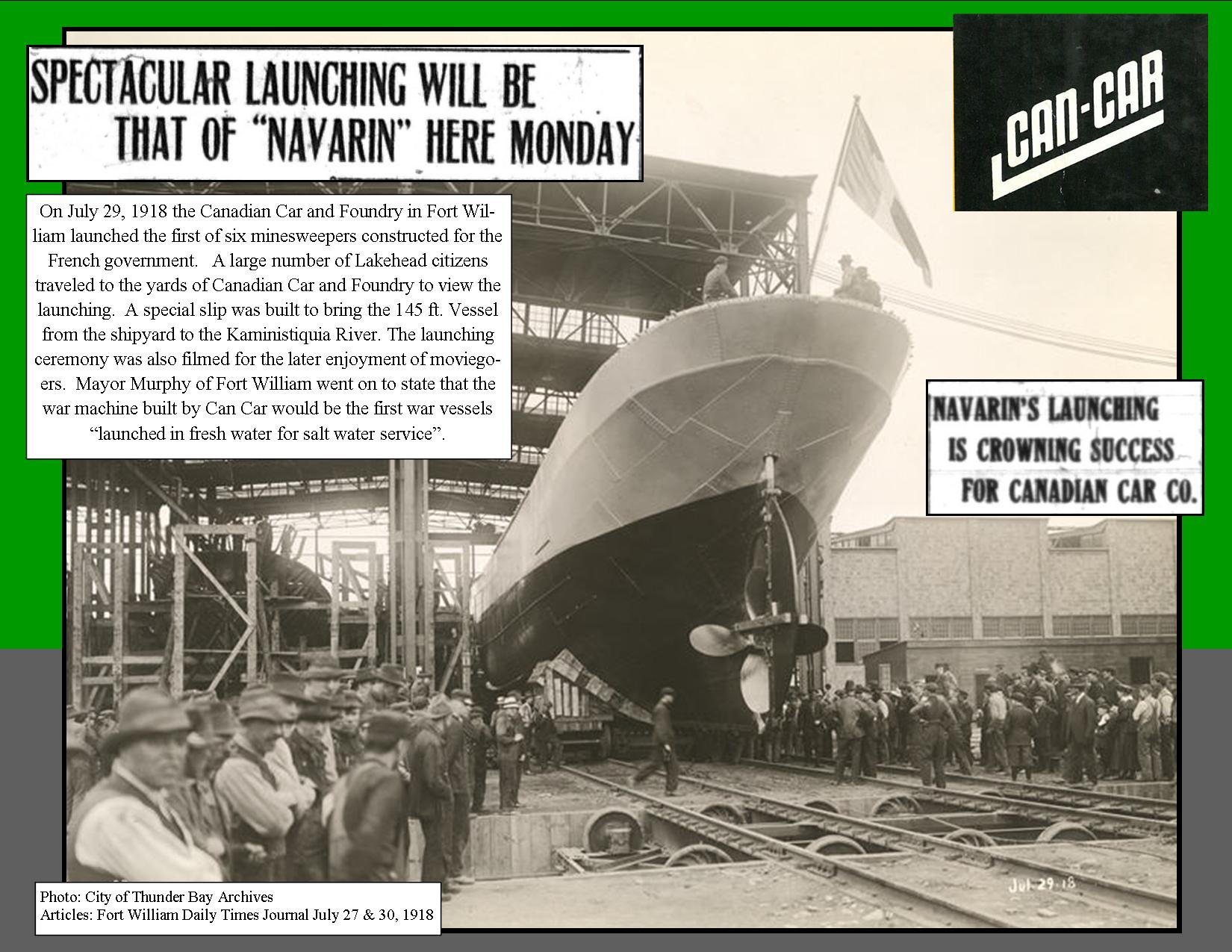 Fort William City Council voted “that the Mayor be authorized to make the necessary arrangements for the storage of shells to be brought in by the officials of the French Government for use on boats being built at the Canadian Car and Foundry Plant.”