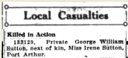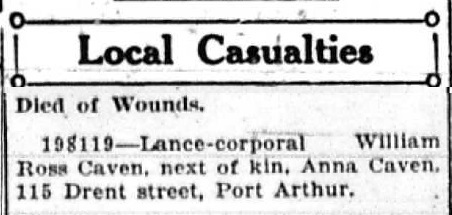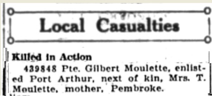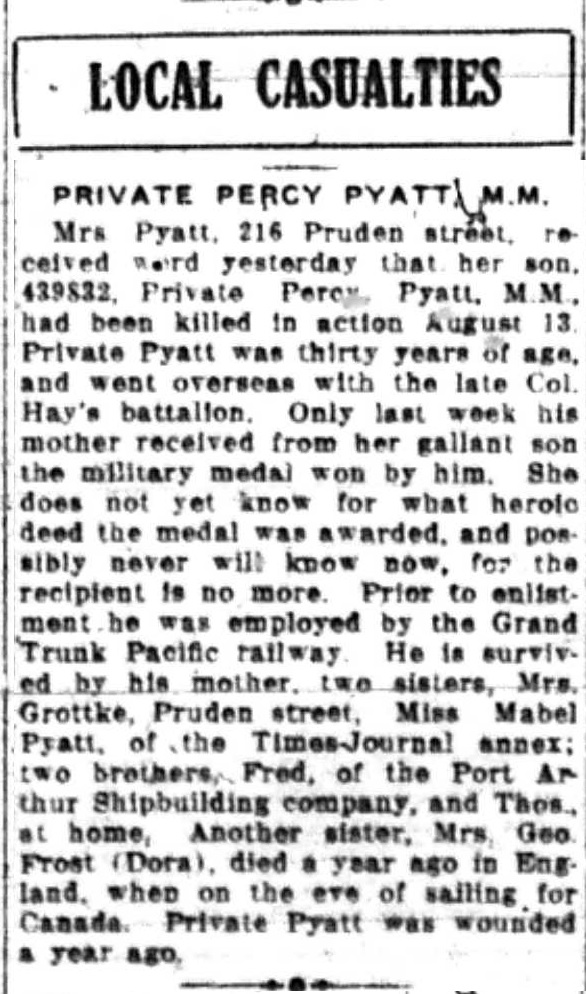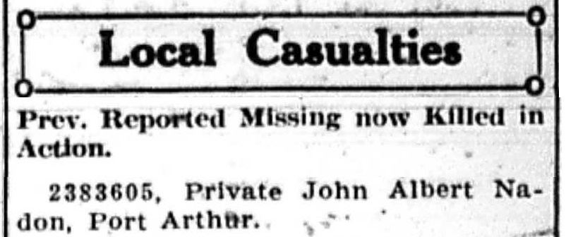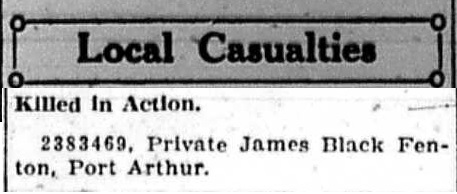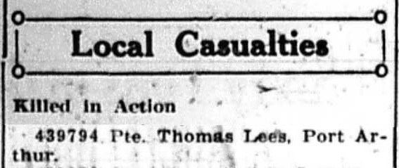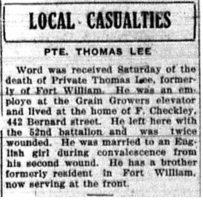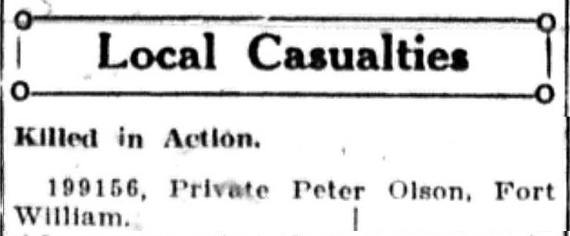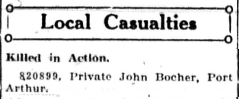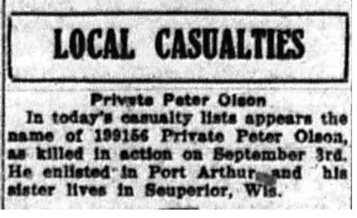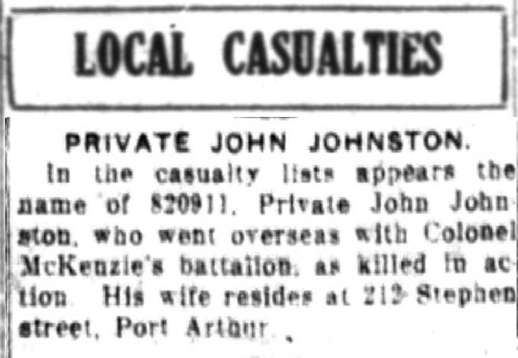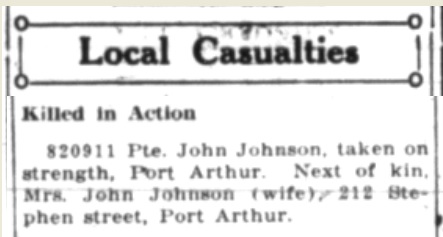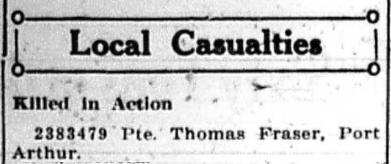 The above index contains published death notices from the Fort William Daily Times Journal (FWDTJ) and the Port Arthur Daily News (PADN), along with links to available attestation papers (through Library and Archives Canada) and Burial Records (through the Commonwealth War Graves Commission) for local individuals who were killed during or as a result of the First World War. The index is updated monthly to coincide with the centennial of these events and commemorate the sacrifice of those individuals and their families. If you know of someone who should be included here, please contact us at ww1project@tbpl.ca.