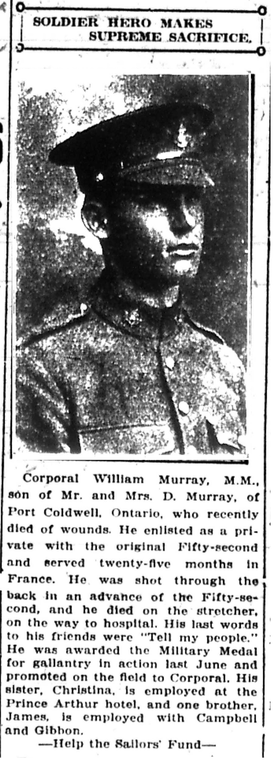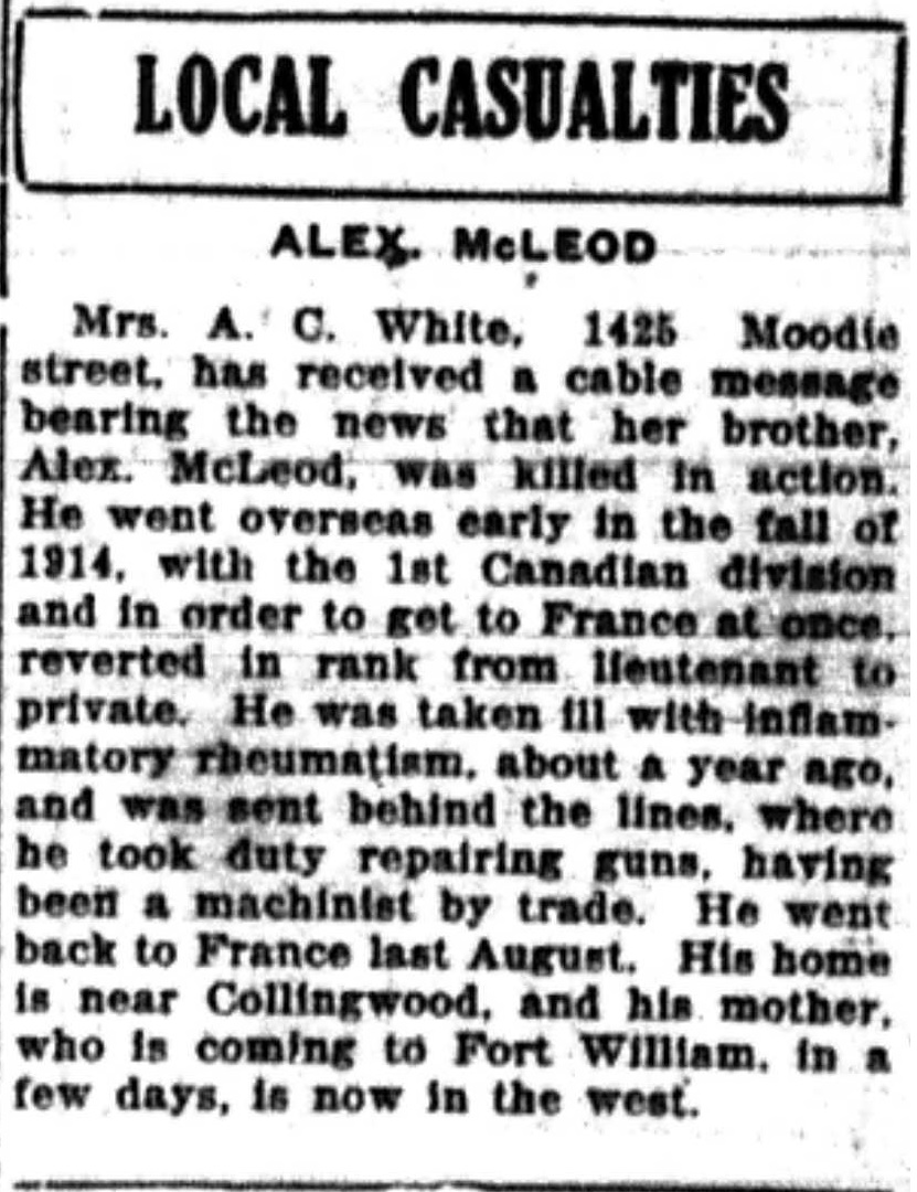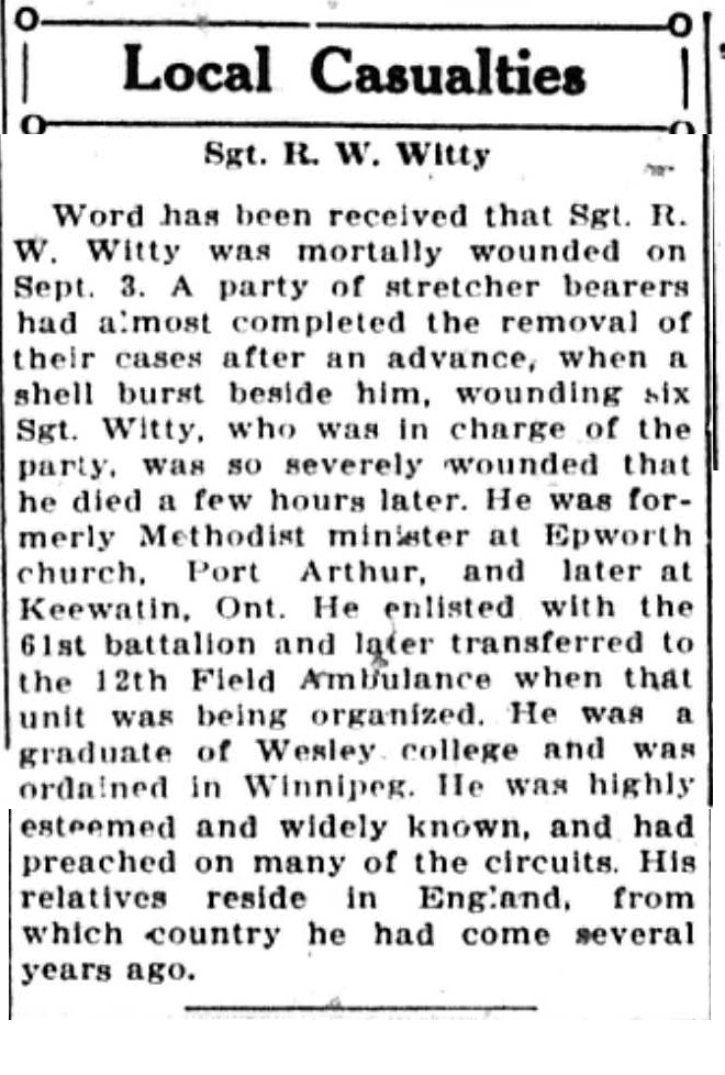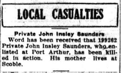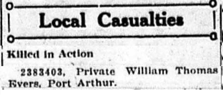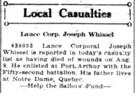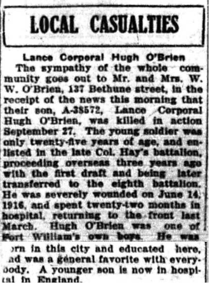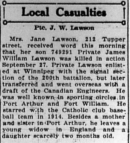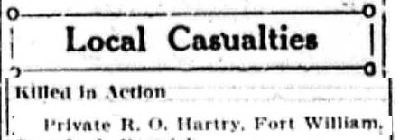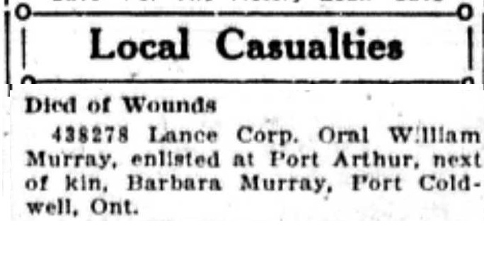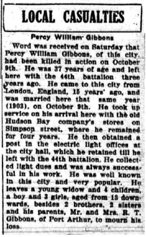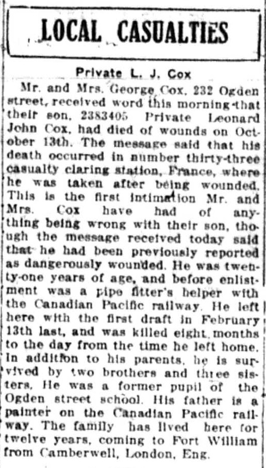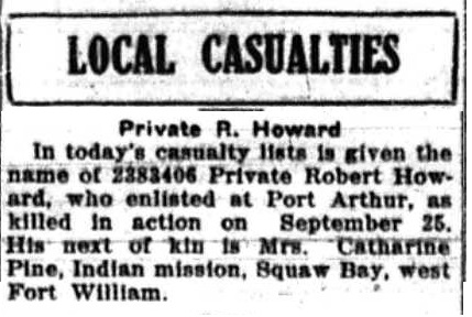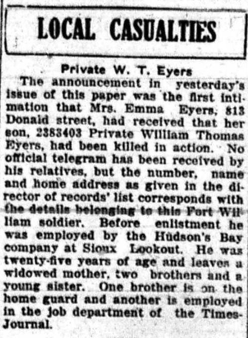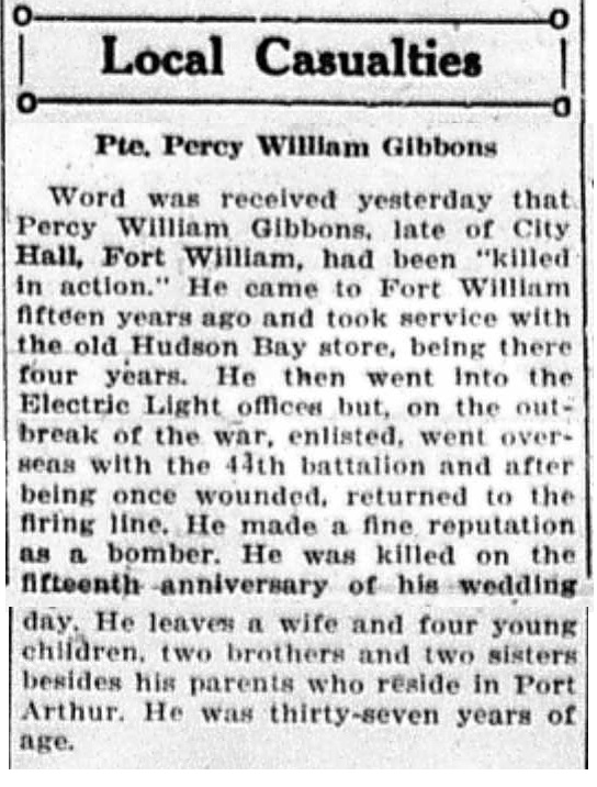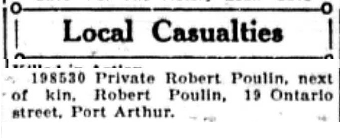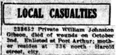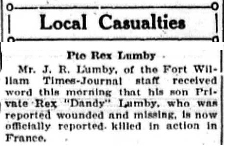 The above index contains published death notices from the Fort William Daily Times Journal (FWDTJ) and the Port Arthur Daily News (PADN), along with links to available attestation papers (through Library and Archives Canada) and Burial Records (through the Commonwealth War Graves Commission) for local individuals who were killed during or as a result of the First World War. The index is updated monthly to coincide with the centennial of these events and commemorate the sacrifice of those individuals and their families. If you know of someone who should be included here, please contact us at ww1project@tbpl.ca.