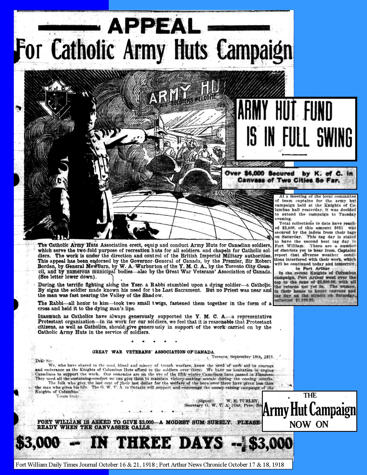 The Fort William council received a letter from the Fort William branch of the Catholic Army Hut Association asking for a donation to provide funds for soldiers in France. The Catholic Army Hut Association is perhaps referring to the Knight of Columbus Catholic Army Huts. The Army Huts were a place for military personnel who have completed active duty and are returning home to have access to services and recreation during the First World War. The Knights of Columbus is still an active organization in multiple countries.