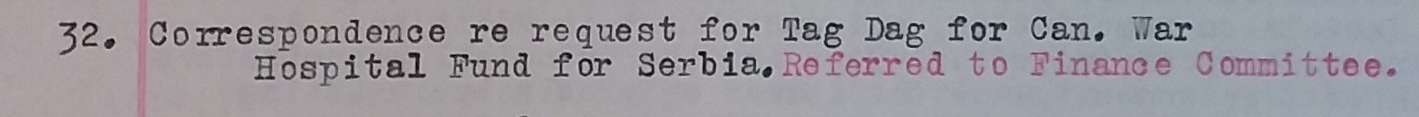 A request for a Tag Day is received by the City Council, and is referred to the Finance Committee. A Tag Day is a day on which money is collected for a charity and donors receive a tag in exchange for their contribution. Here the Council has received correspondence regarding a Tag Day to raise money for Canadian War Hospital Fund for Serbia.