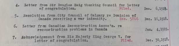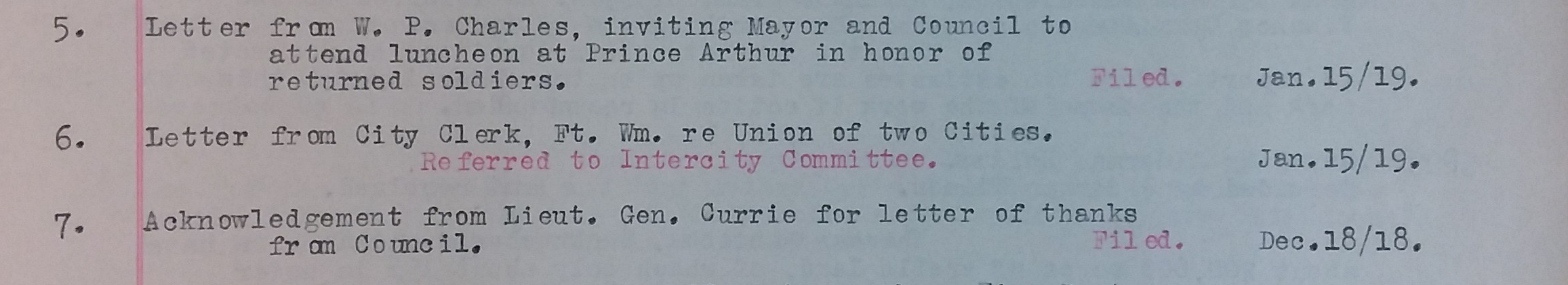 At the second City Council meeting of 1919, correspondence was received from W. P. Charles inviting the City Council and the Mayor to a luncheon at the Prince Arthur in honour of the returned soldiers. Acknowledgement of the city’s congratulations in regards to the war was also received from the Lieutenant General Arthur Currie (See Sir Arthur Currie).