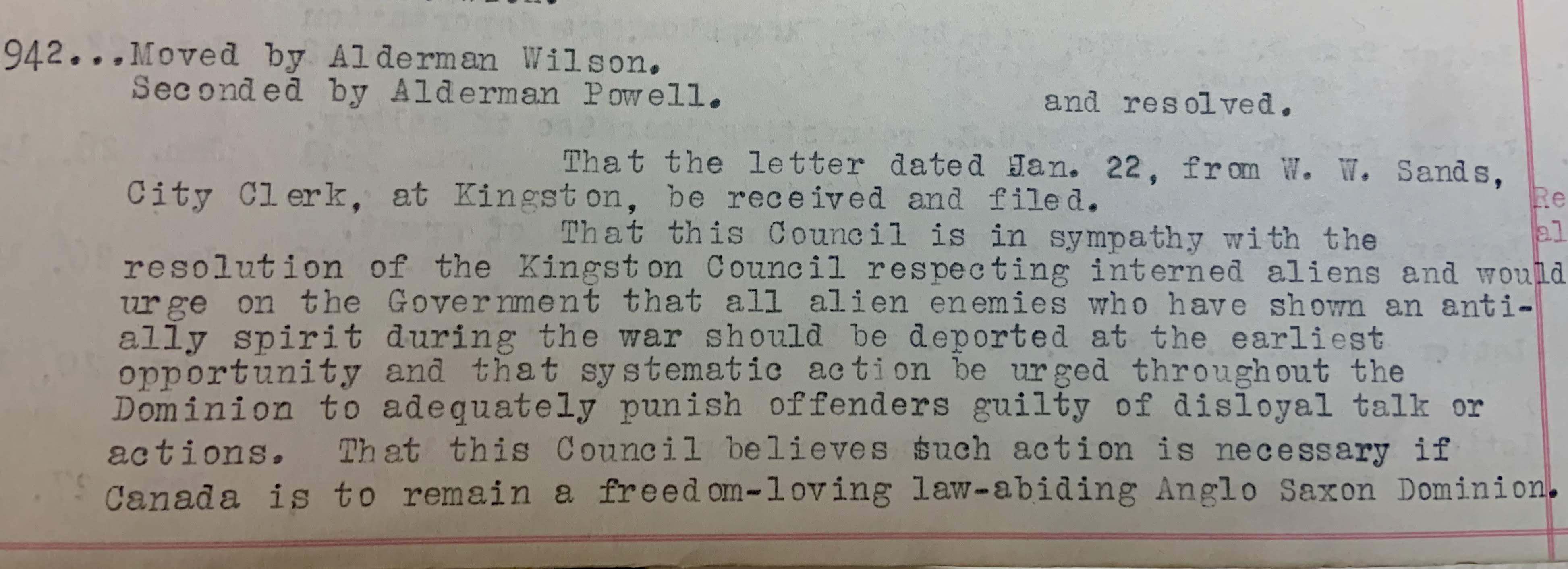 The City Clerk of Kingston, W. W. Sands has written to the Port Arthur City Council regarding enemy aliens* in Canada. The Council agrees with Kingston’s resolution that all “alien enemies who have shown an anti-ally spirit during the war should be deported at the earliest opportunity and that systematic action be urged throughout the Dominion to adequately punish offenders guilty of disloyal talk or actions.”