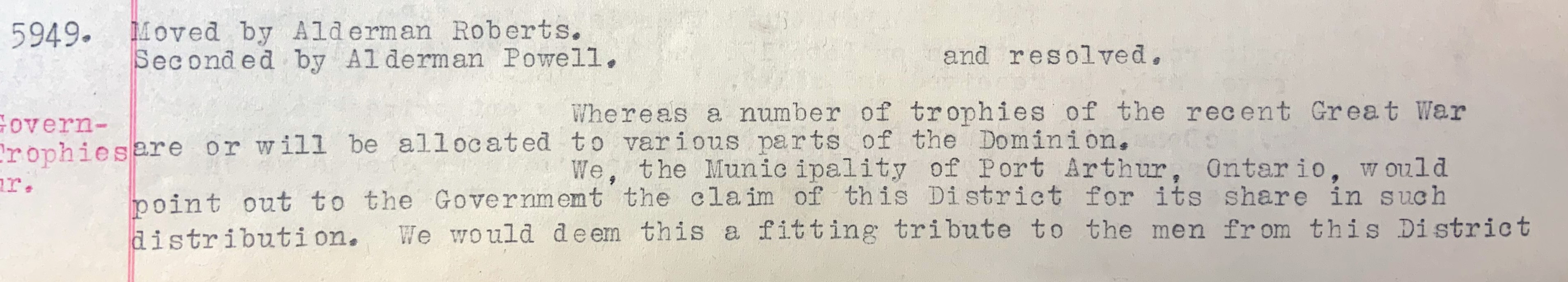 Trophies from the Great War are being allotted to various parts of the Dominion (Canada) and Port Arthur City Council is requesting a share of the war trophies as a tribute to the men from the Port Arthur district who fought in the war. Read more in the Canadian War Museum’s article about War Trophies.