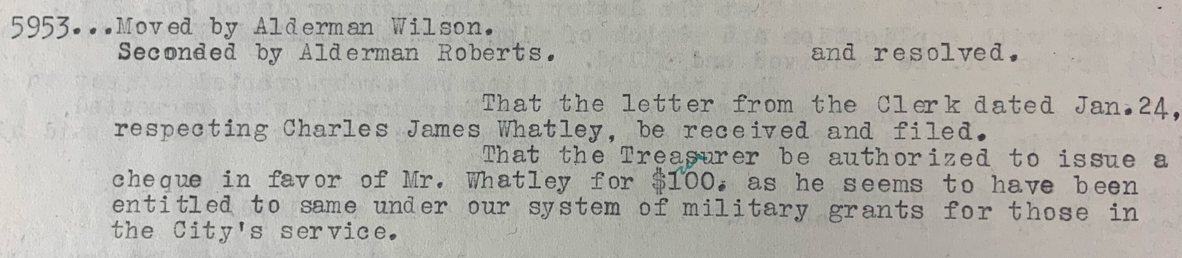 A $100 ($1,307.84 in today’s dollars) military grant was given to Mr. Charles James Whatley “as he seems to have been entitled to” for his service to the City. The City of Port Arthur granted every civic employee who enlisted for Military Duty a sum of money and the promise of being able to return to their job upon their return.